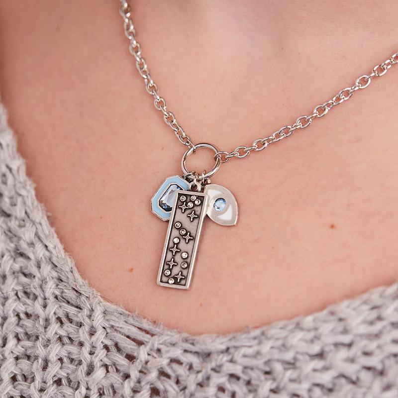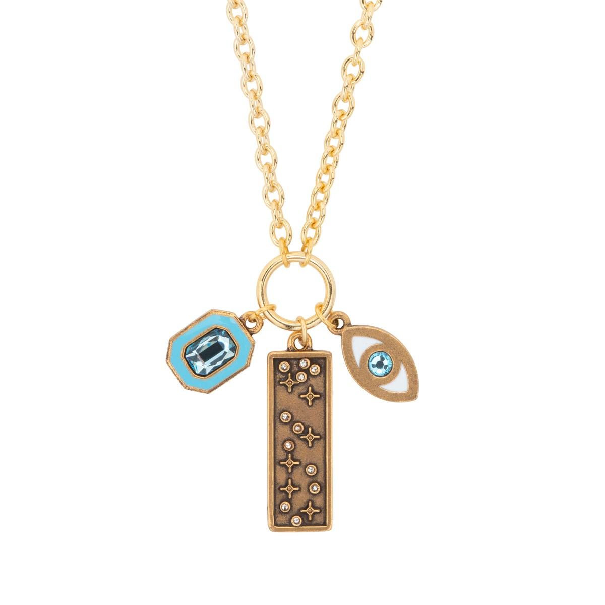 Curated and coordinated to draw positive energy your way, this Evil Eye Talisman Necklace delivers a trio of handcrafted charms in soothing silver tones and light blue crystal hues. Choose this piece for spiritual centering and a symbolic statement of serenity.