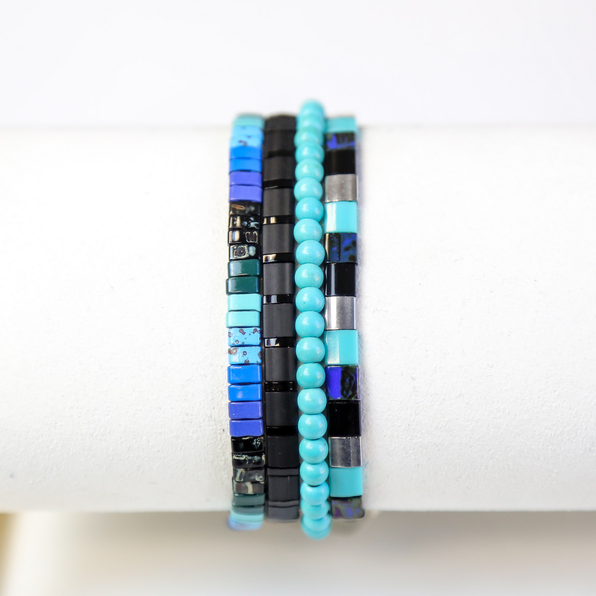 Our Abyss stack includes four total bracelets! (Yes, 4!!) Included in the stack are 3 tila bracelets with gorgeous colors of Green, Blue, Dark Blue, Purple, Matte Black, Glossy Black, and Silver. It also includes a Light Blue bead bracelet.