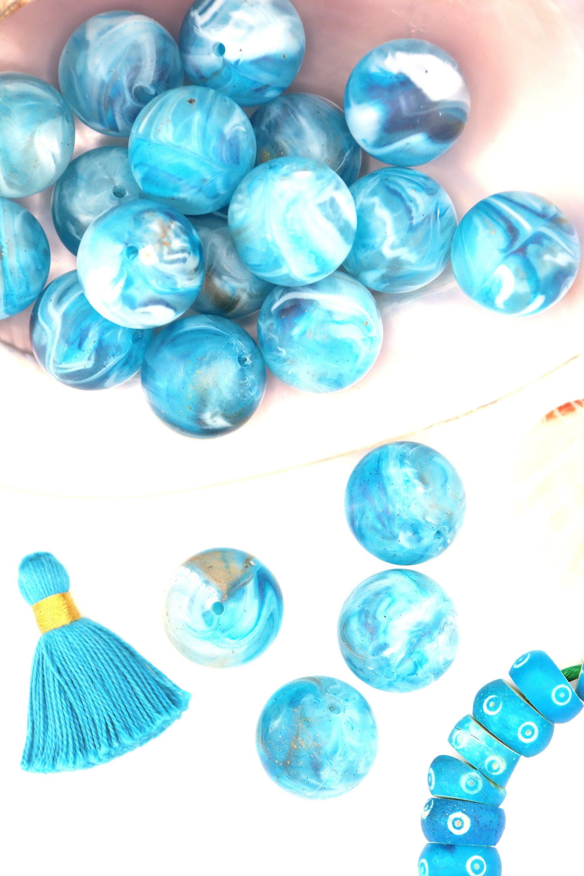 Color: A swirl of turquoise, light blue, white, flecks of brown.