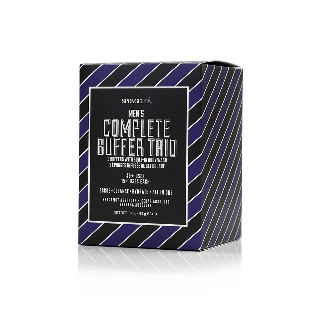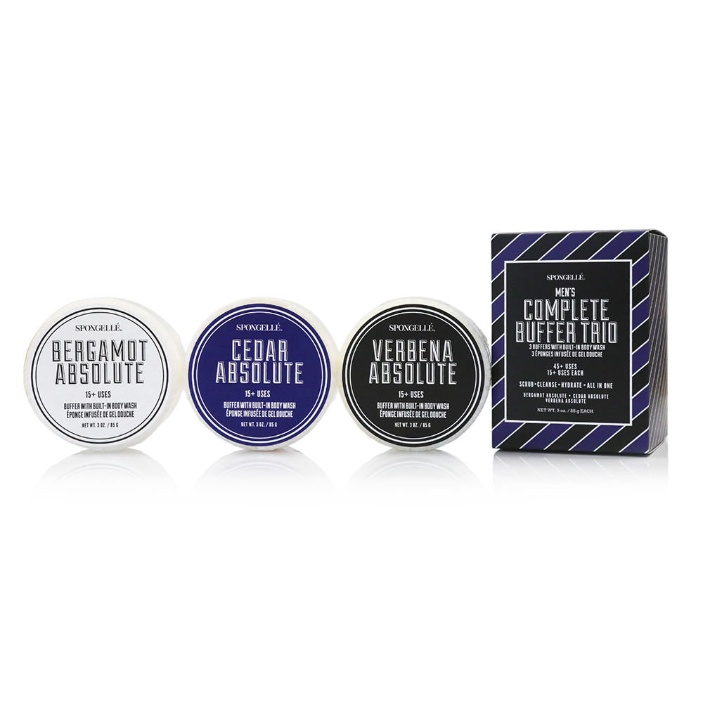 Body Buffer Trio Set includes 3 full size Body Wash Infused Buffers in Verbena Absolute, Cedar Absolute, and Bergamot Absolute. Each pre-filled body wash buffer is good for 15+ uses each.