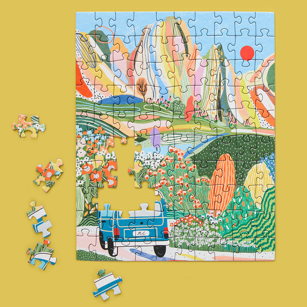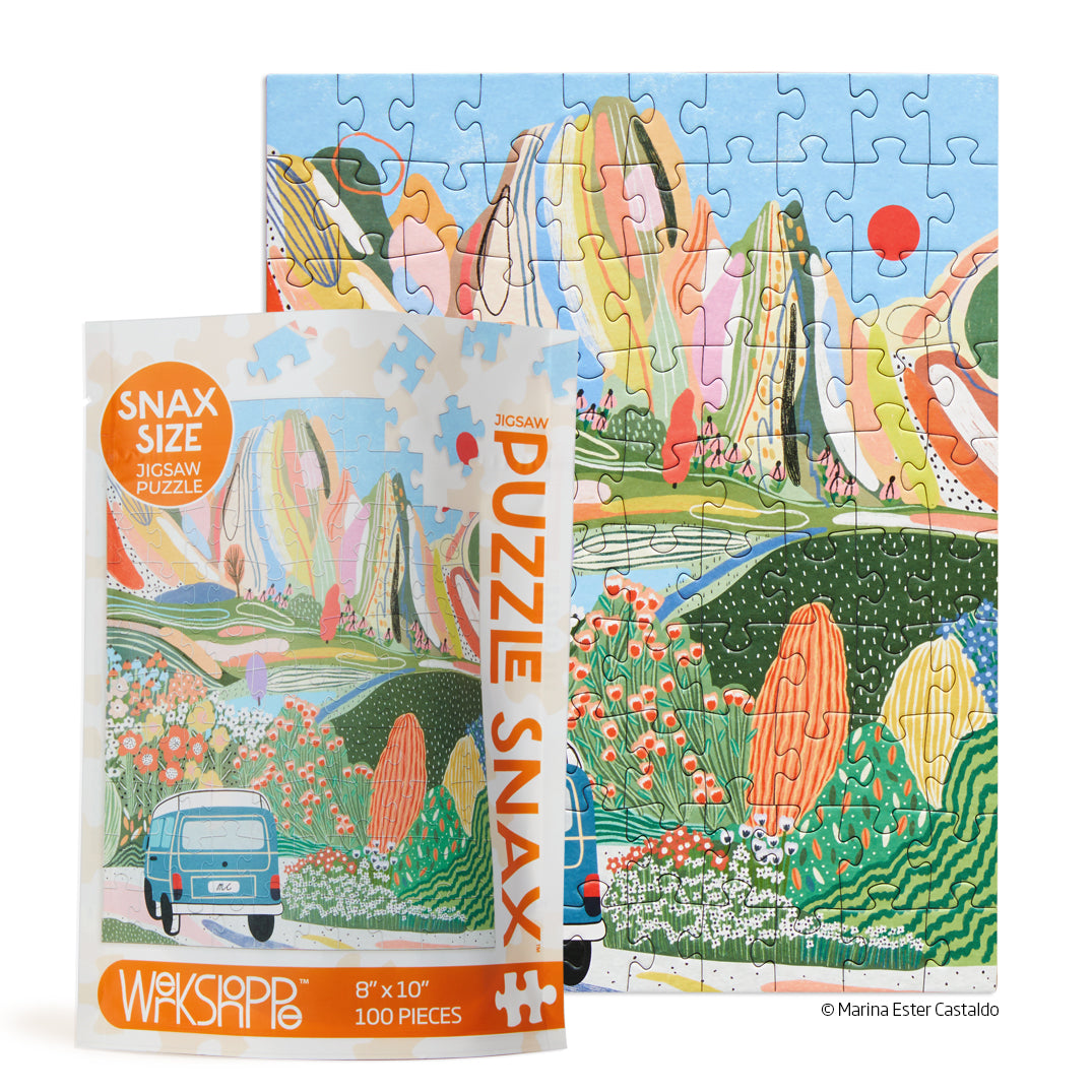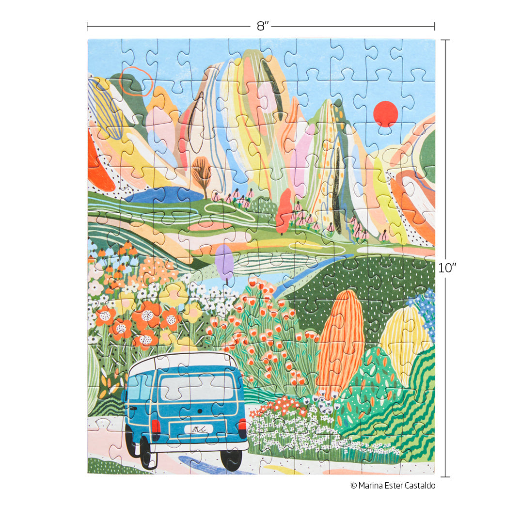 Day trippin' in a van! This vintage VW van is on a roadtrip through a brightly colored landscape.