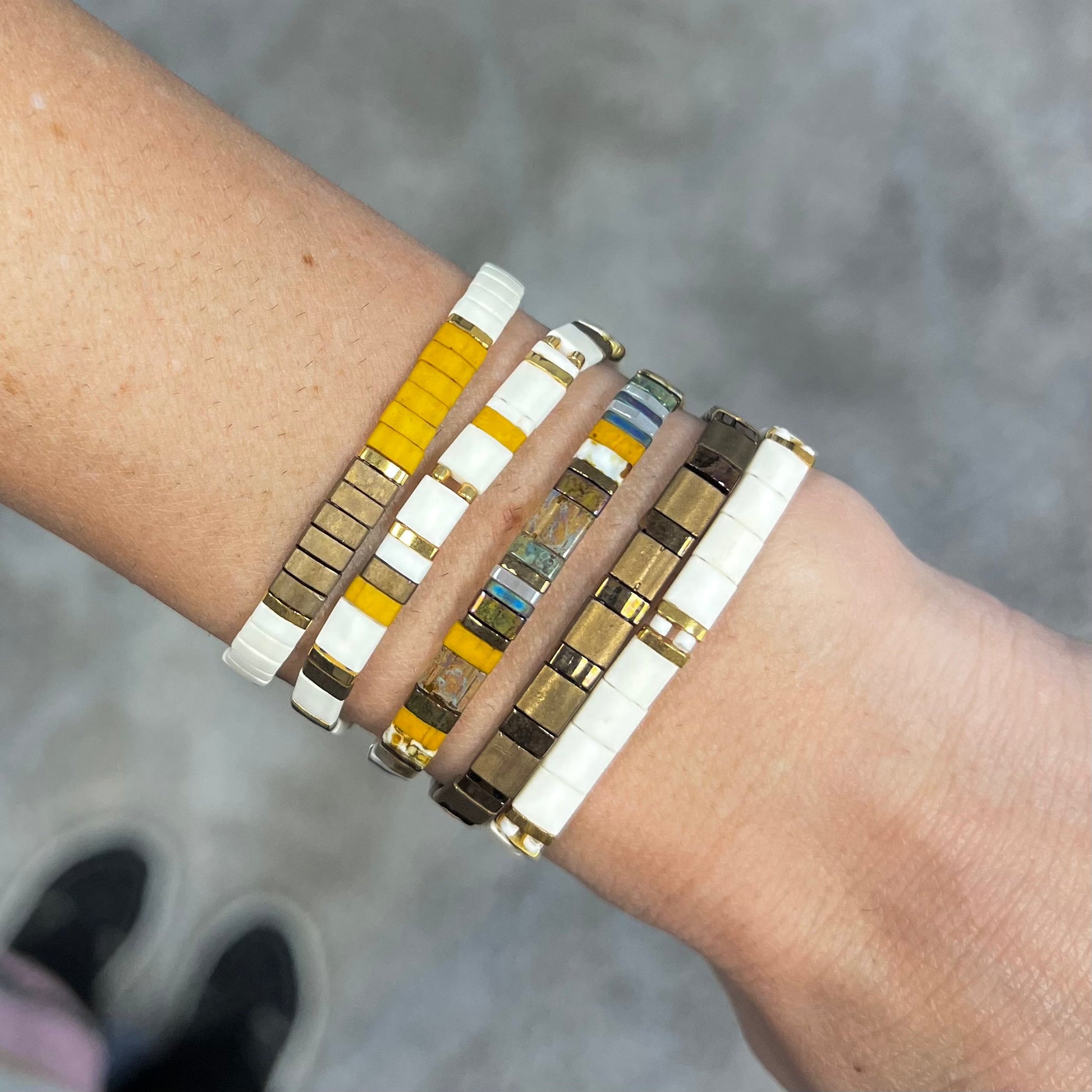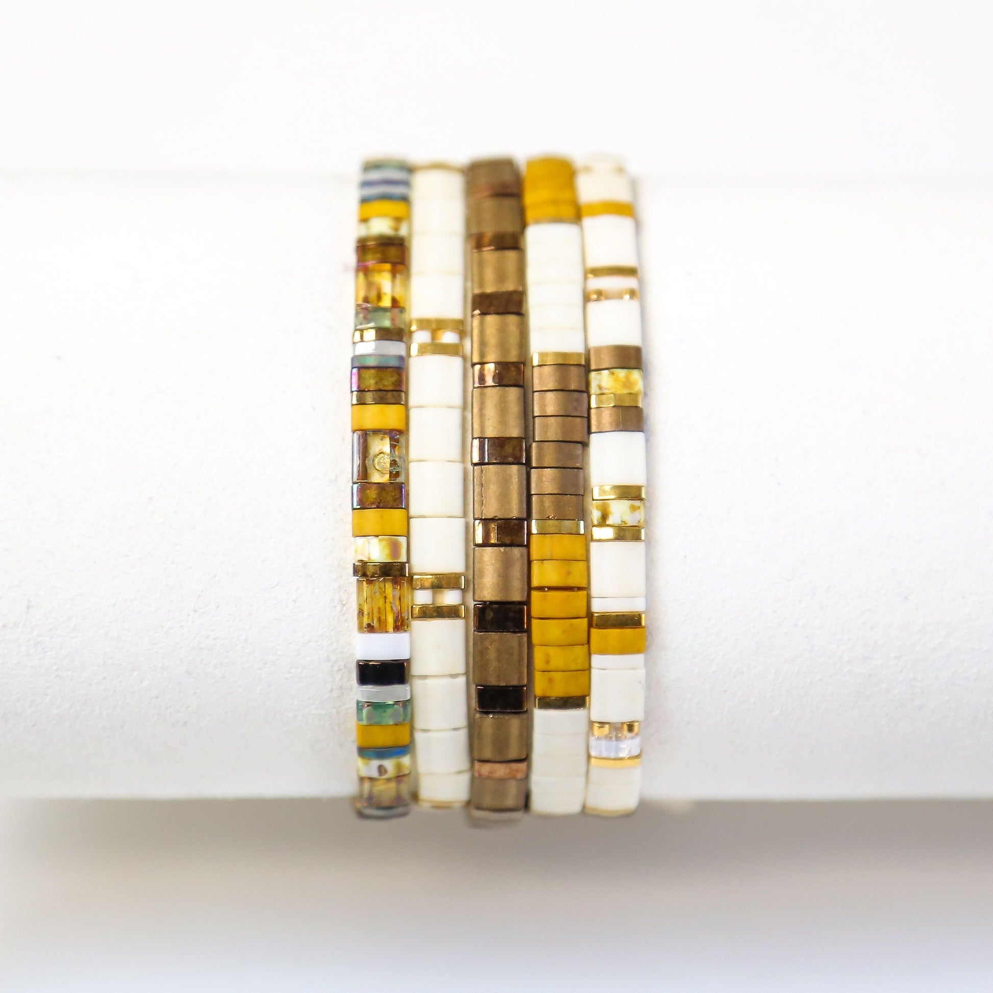 The DEATH VALLEY Tila Bead Bracelet Stack includes five total bracelets! (Yes, 5!!) Included in the stack are 5 tila bracelets with gorgeous colors of Bronze, Orange, Copper, Brown, White, and Gold.