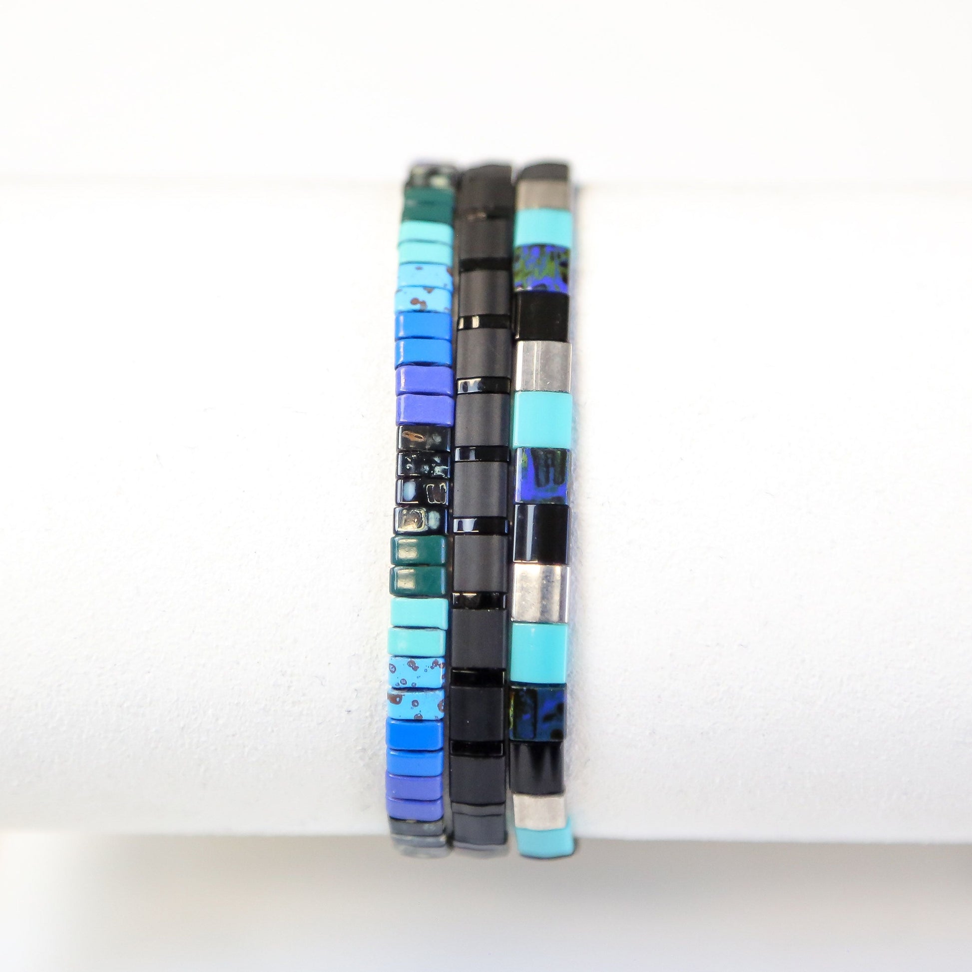 Our DESCEND Tila Bead Bracelet Stack includes three total bracelets! (Yes, 3!!) Included in the stack are 3 tila bracelets with gorgeous colors of Green, Blue, Dark Blue, Purple, Matte Black, Glossy Black, and Silver.