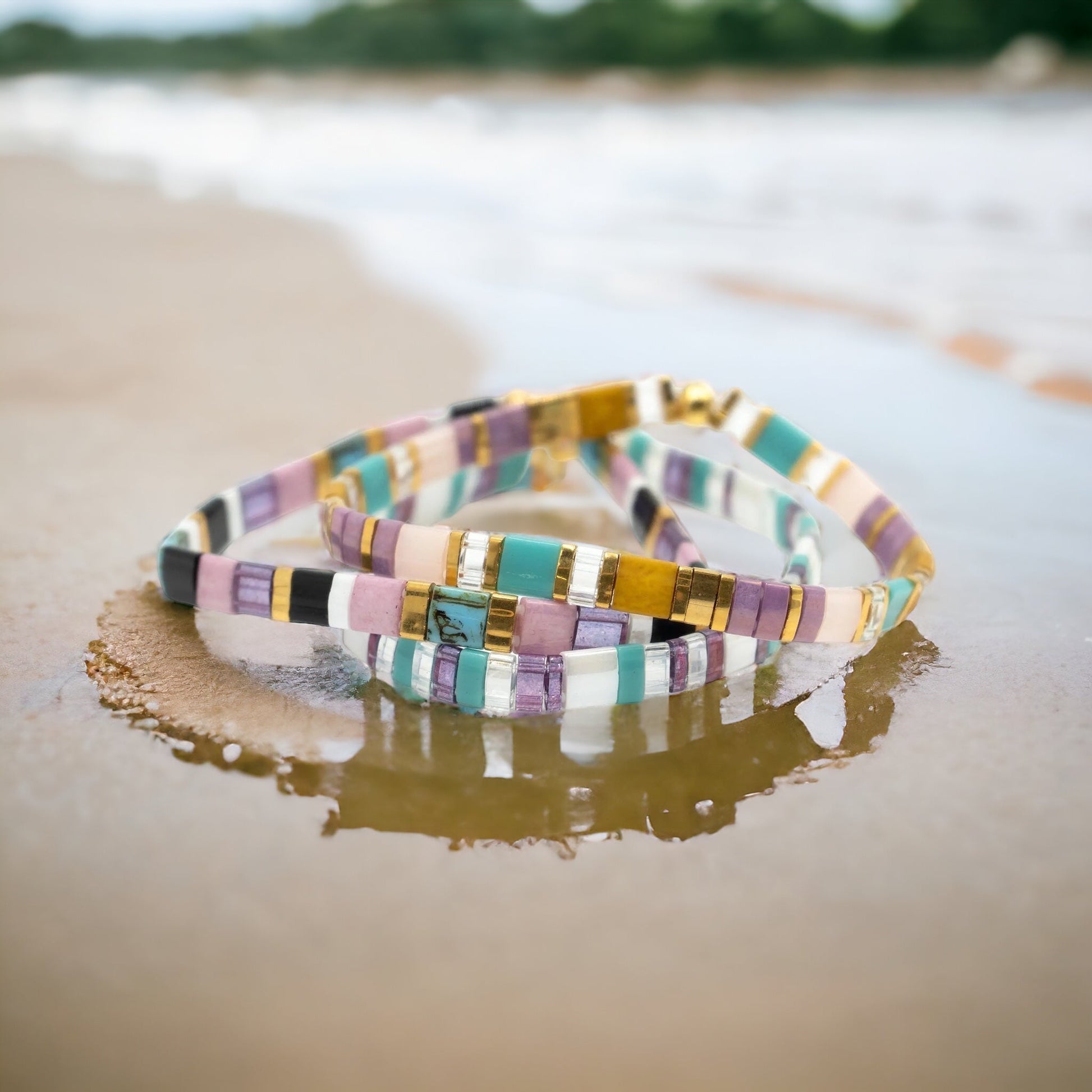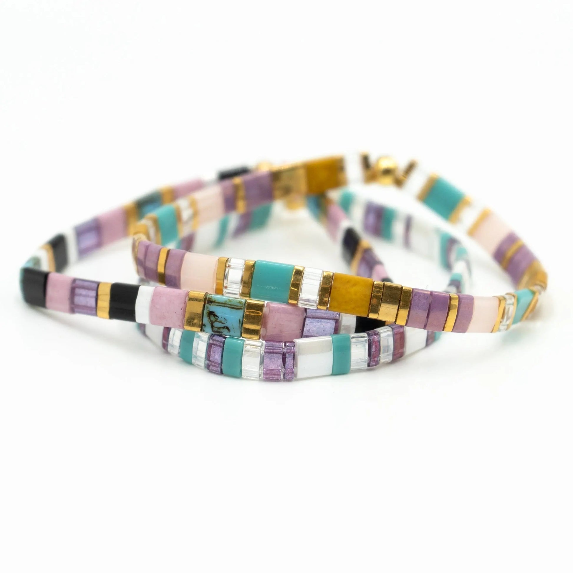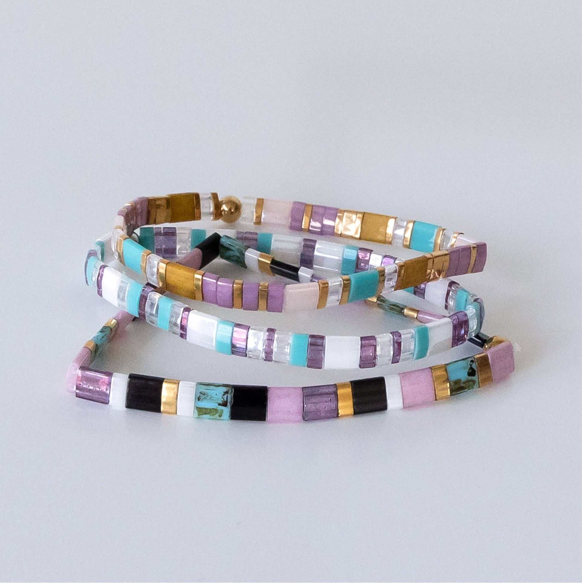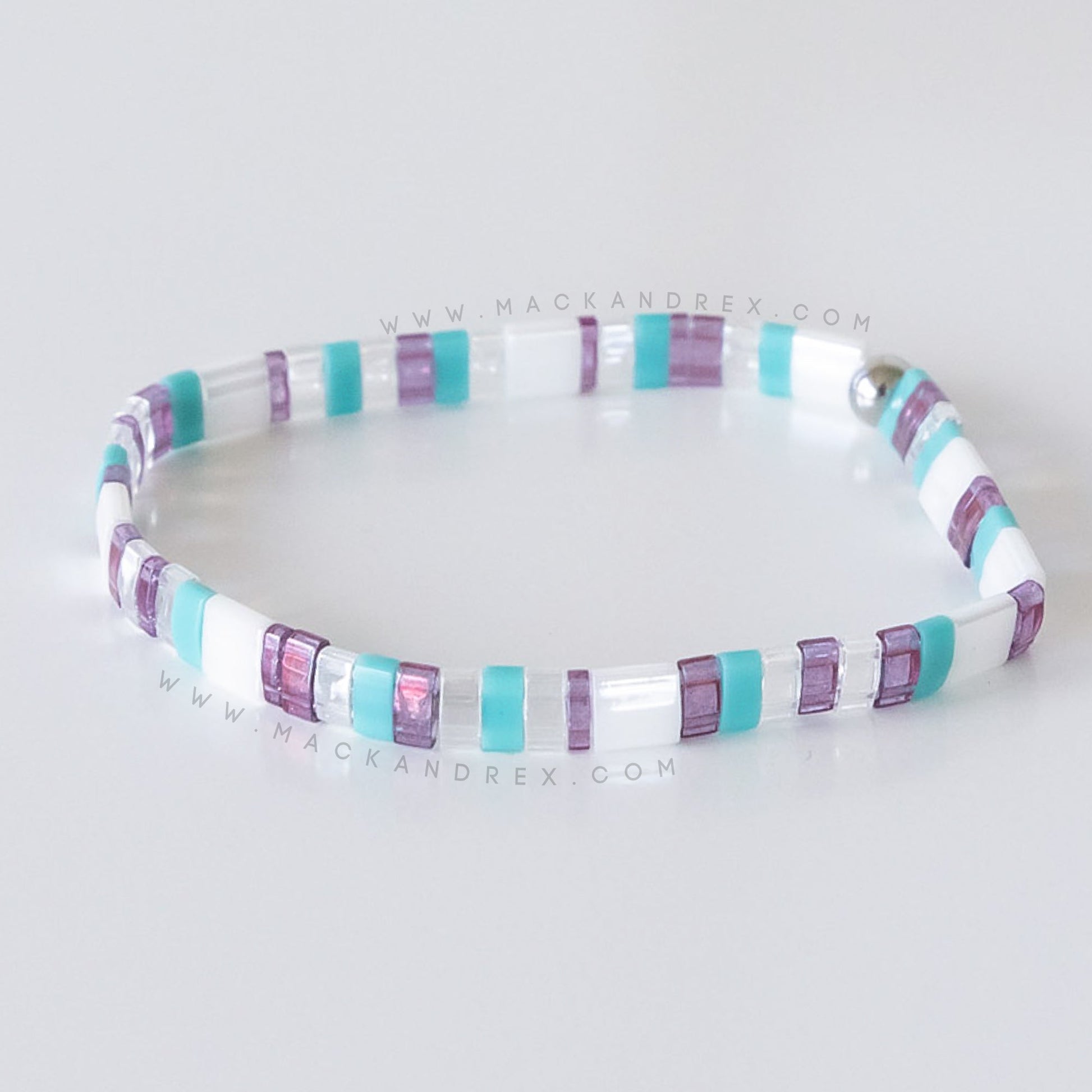 Our tila bead bracelets are handmade in Utah, and are made once your order is placed. We use a very expensive crystal elastic cord that is clear in color. We use the highest quality beads from a manufacturer based out of Japan, known as one of the best glass bead producers in the world. The tila beads themselves are small, flat, 2-hole glass beads, or glass tile beads. The square tile beads are about 5mm in size. When finishing our bracelets, we knot them multiple times AND glue them. We use E6000 glue, one of the best glues for beading and fabrics. Multiple years of experience has gone into the strength & stretch of elastic we use, hot tight to tie the knots and finding the highest quality and best colors of beads, and best way to finish them to ensure they last as long as possible!