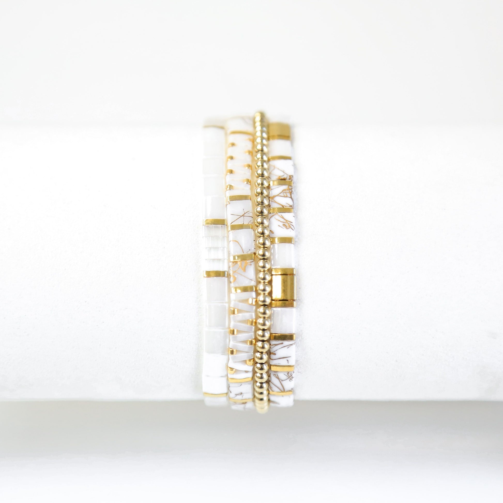 Our ENDLESS stack includes four total bracelets! (Yes, 4!!) Included in the stack are 4 tila bracelets with gorgeous colors of White, and Gold. It also includes a Gold bead bracelet