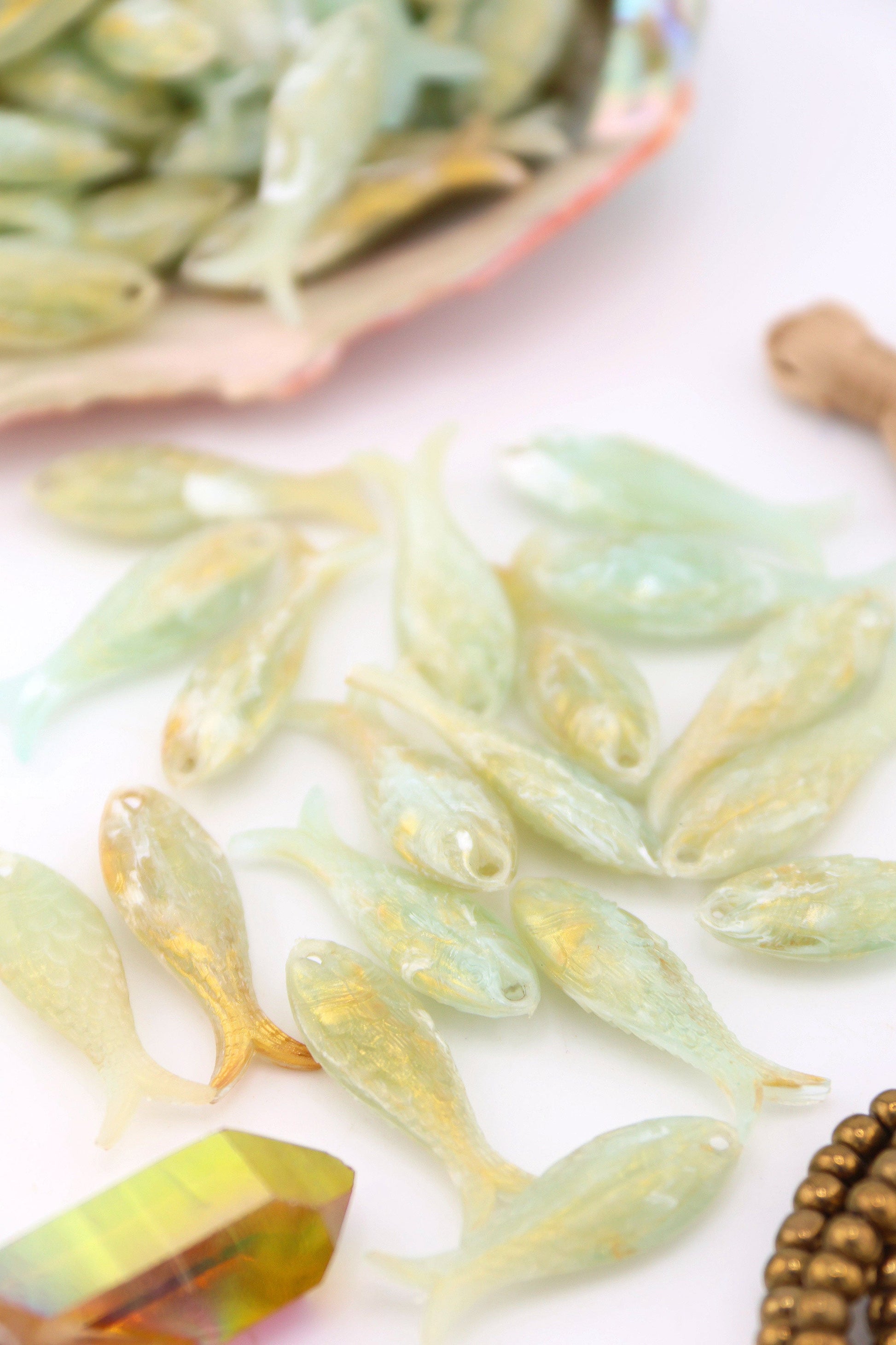 Subtle shimmer, ocean magic—these golden sage resin fish charms are a dreamy addition to your DIY stash. 🌊 Each charm is cast in translucent sage green resin with flecks of golden shimmer that catch the light like sunlight on water. Their carved scale detail gives them texture and depth, making them perfect for jewelry with a little whimsy and shine.