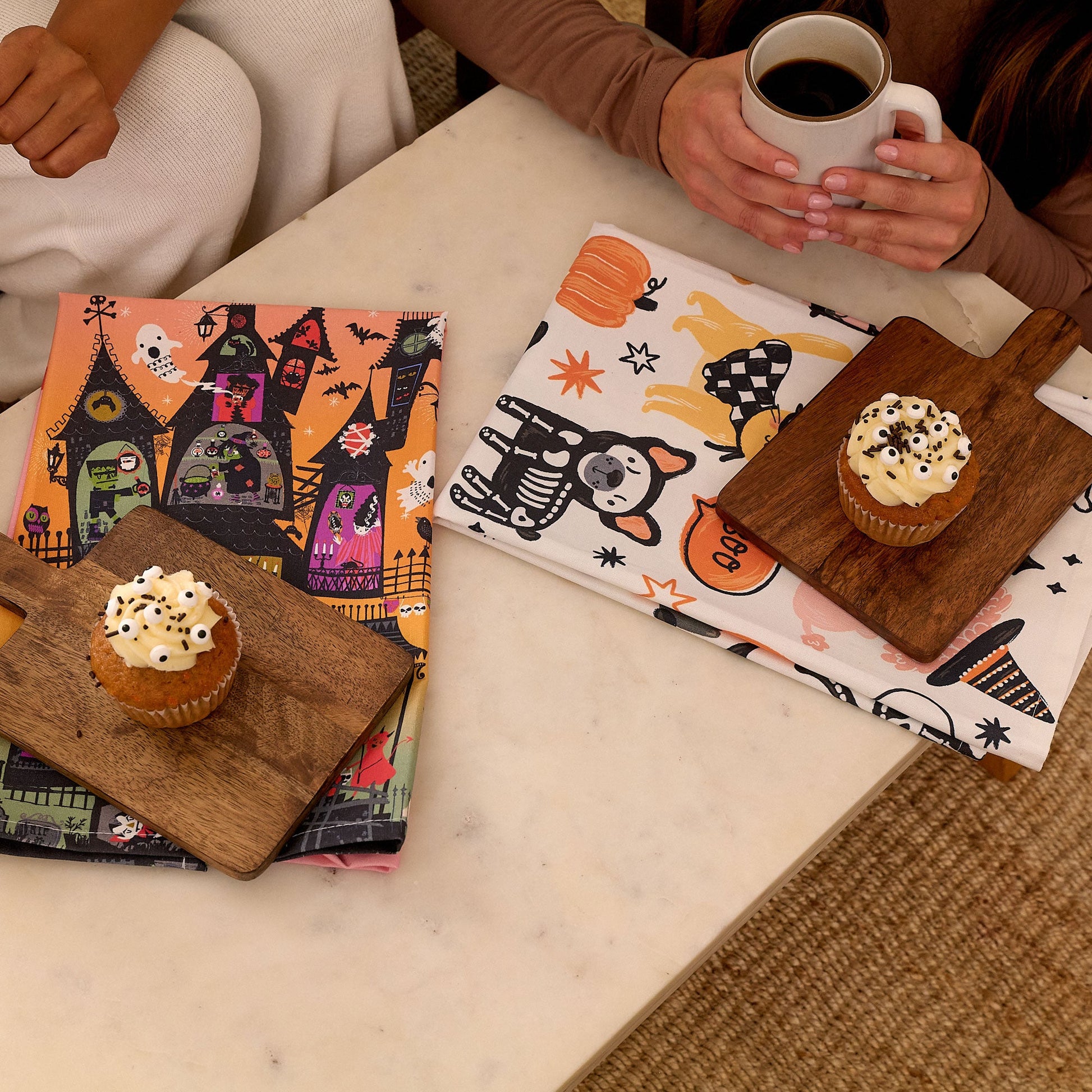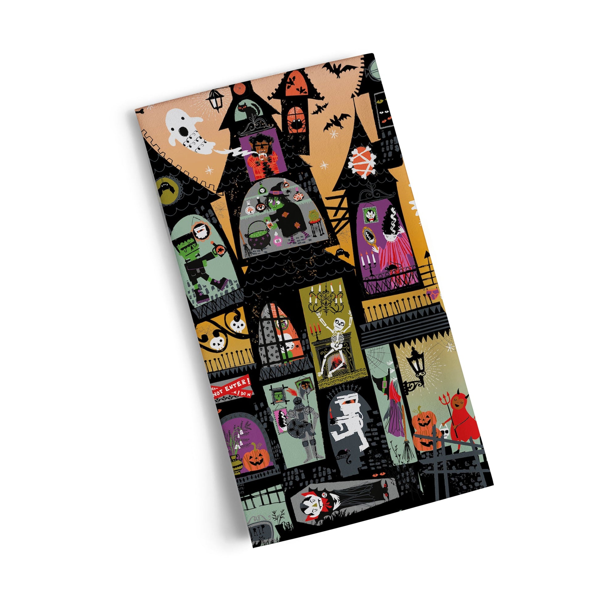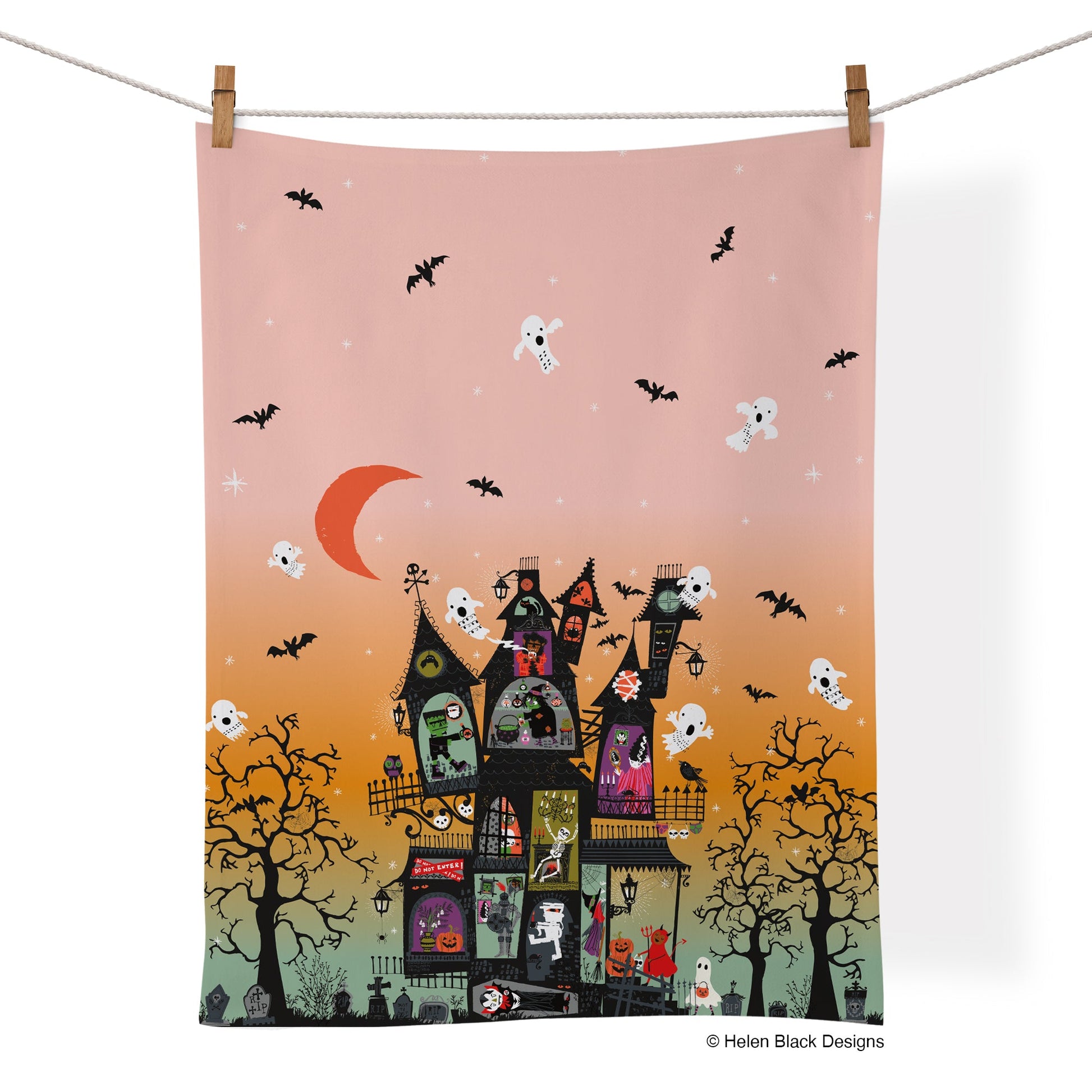 Trick or Treaters beware of this haunted house, where every window reveals ghostly apparitions, cobwebs, and mysterious shadows. The intricate artwork brings each chilling detail to life in this kitchen tea towel.