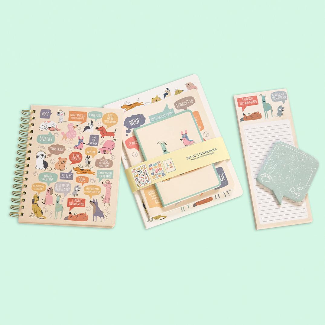 A whimsical design that's sure to bring a smile to all dog lovers. This set of 3 coordinating and graduating in size stitched notebooks has an adorable assortment of dogs with distinctive personalities and thought bubbles of what they would tell us, if they could.