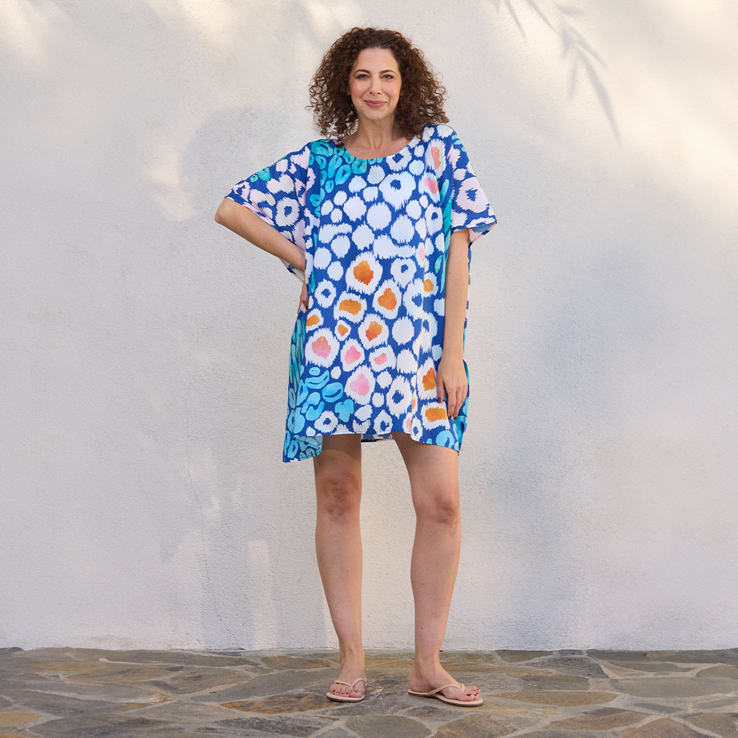 A contemporary approach to an abstract jaguar design in this short caftan is so flattering and cool to wear anywhere.