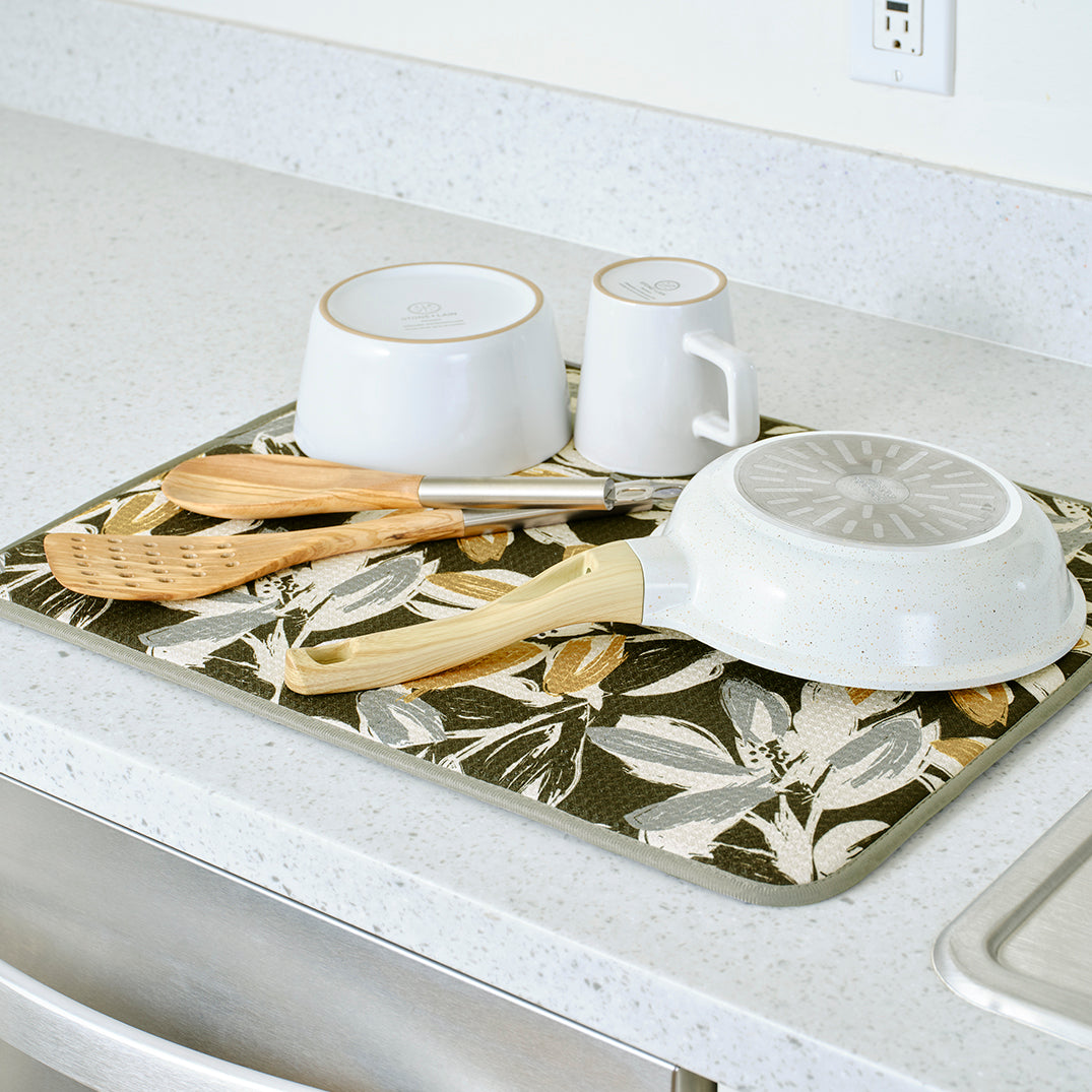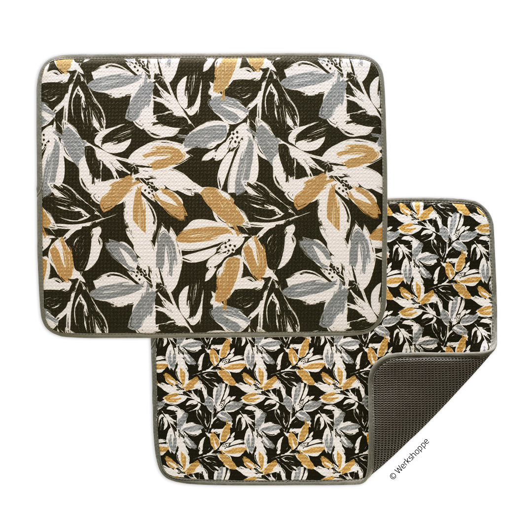 Décor and function are on double duty with this set of 2 coordinating microfiber dish drying mats featuring a black ground abstract leaves and an attractive mosaic tile pattern.