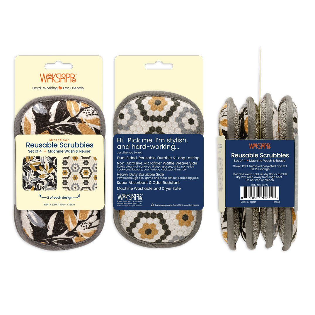 Make kitchen duties a little bit brighter and easier with these bright and bold patterned microfiber scrubbies. Two different coordinating designs in a set of 4 transforms a routine everyday chore into an all-round better experience. With a durable printed microfiber waffle weave on one side and an effective scrubbing material on the other, they are quick drying, washable and reusable - a must-have in any kitchen.