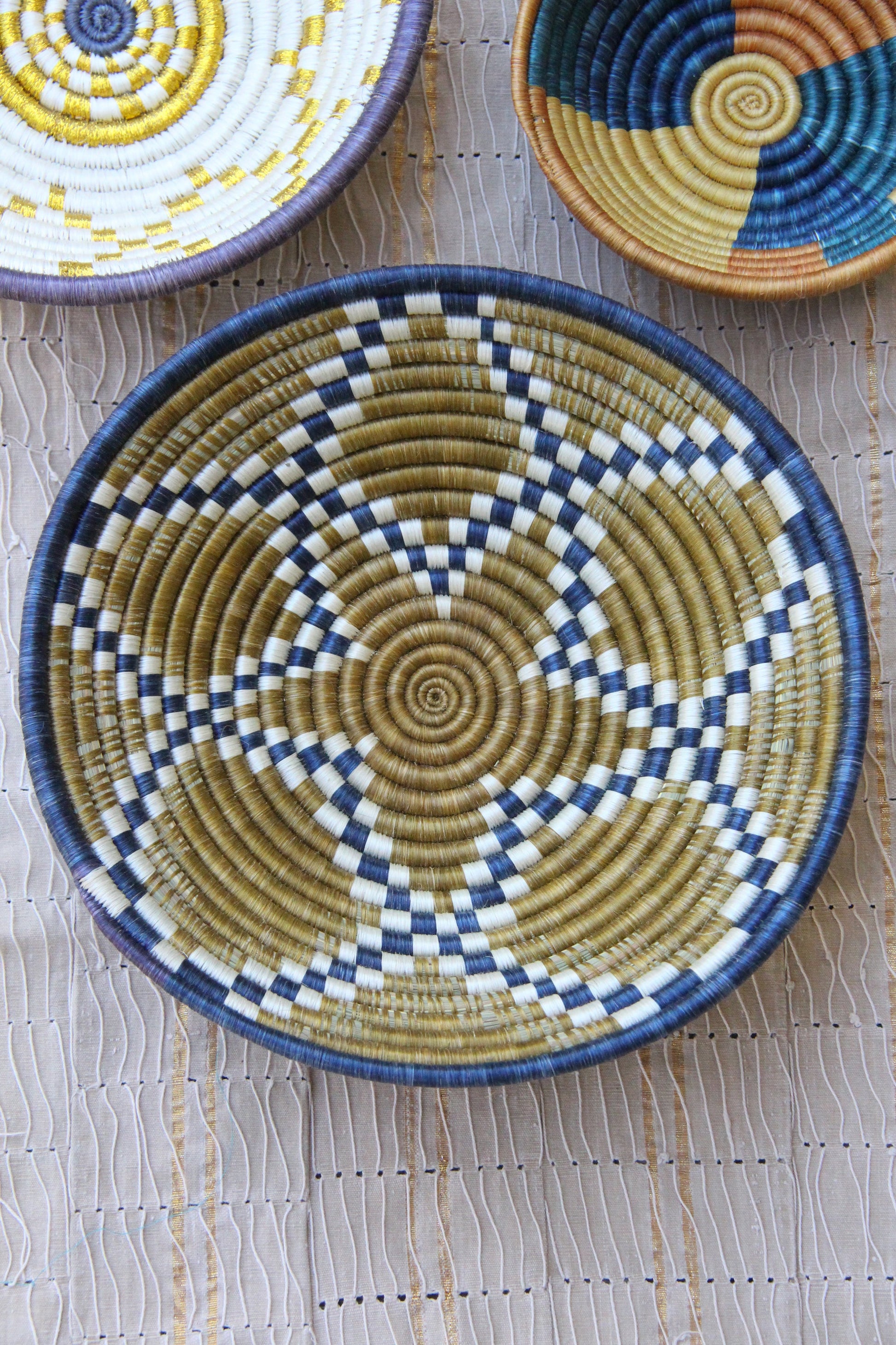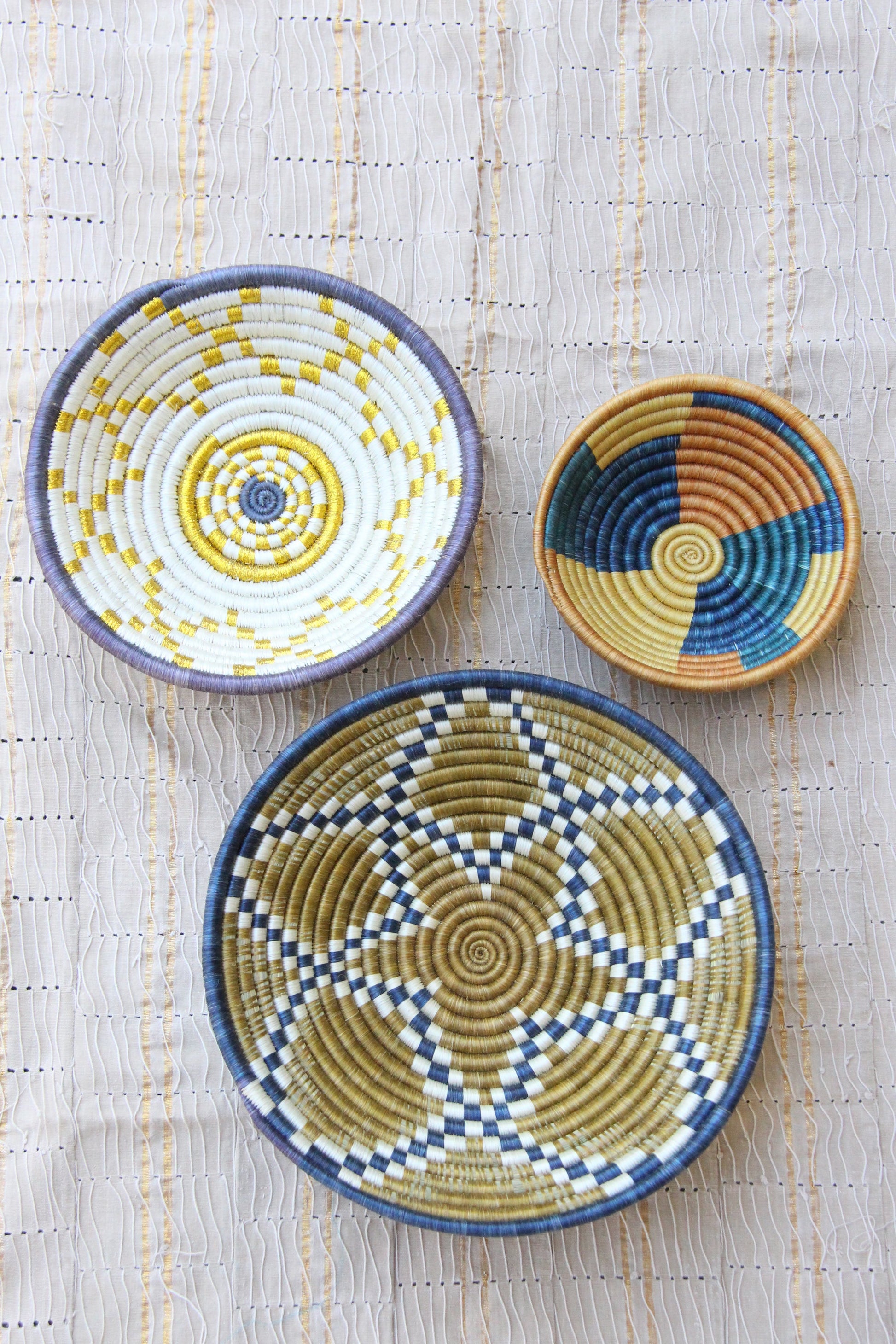 Add some pizzazz to a boring wall or tabletop with this curated and cohesive collection of blue, tan, and golden African baskets. This earthy set makes it easy to create a global boho home. Handcrafted in Rwanda by women, from Sisal wrapped around native grasses, these vibrant baskets are not only beautiful, but widely functional too.