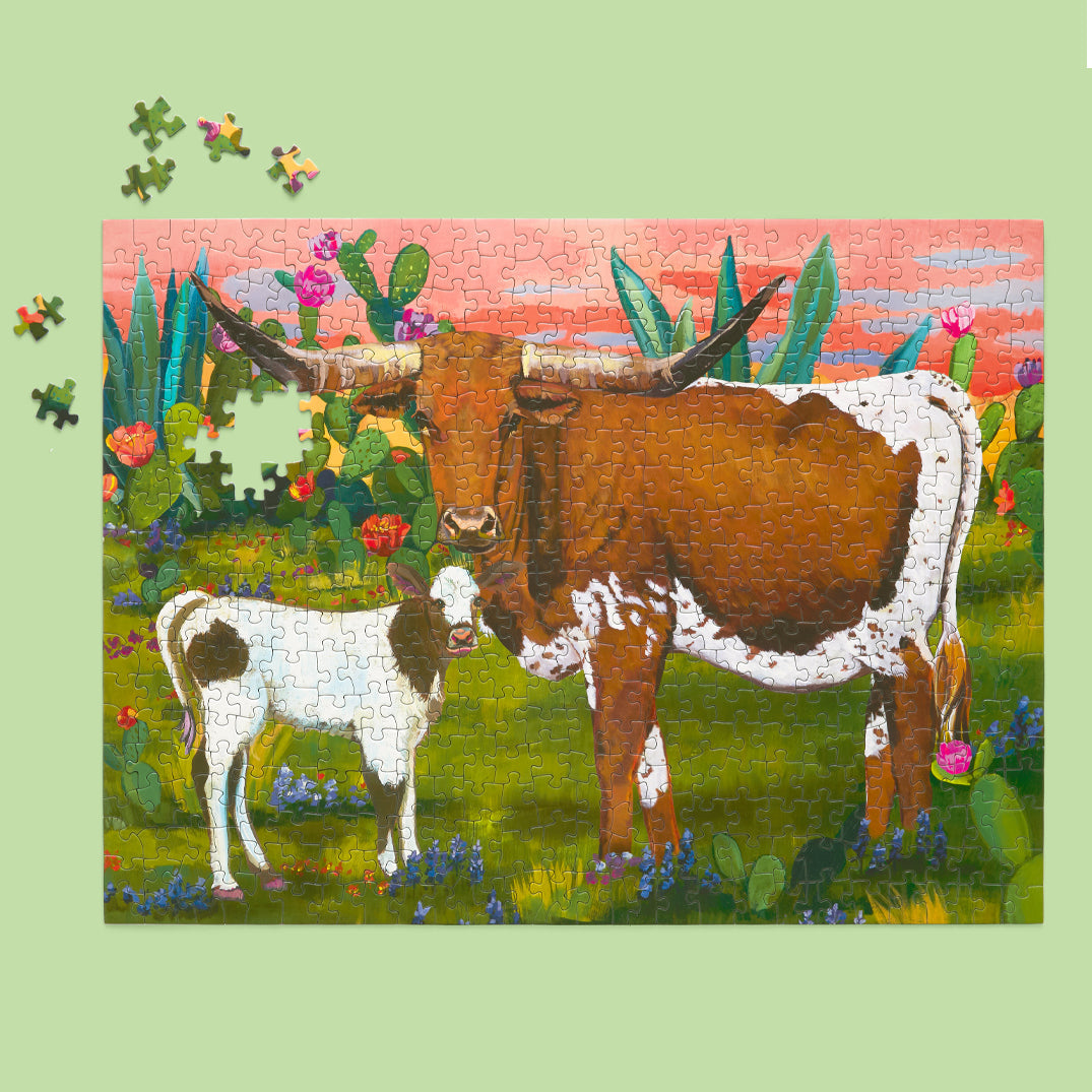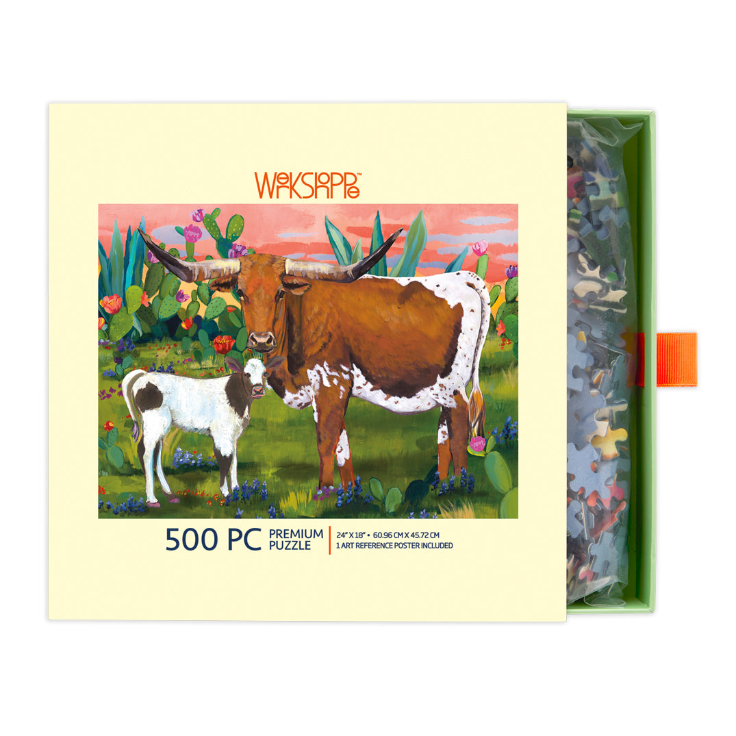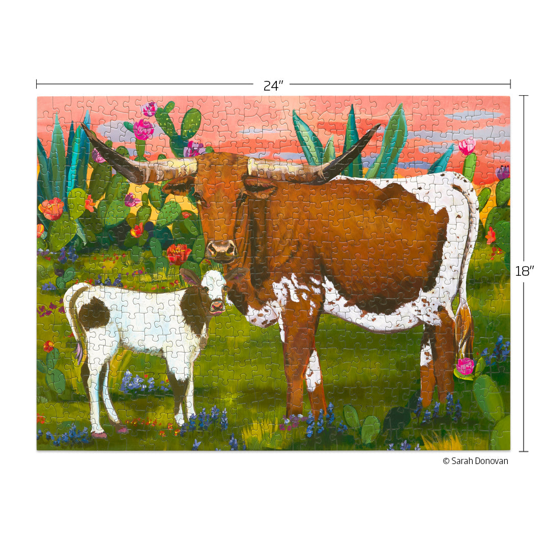 Experience the American longhorn in a natural prairie setting with this stunning 500-piece jigsaw puzzle. The silhouette of a longhorn cow and her tender calf is captured in colorful detail from the animals' calm gazes to the hazy layers of the rugged landscape.