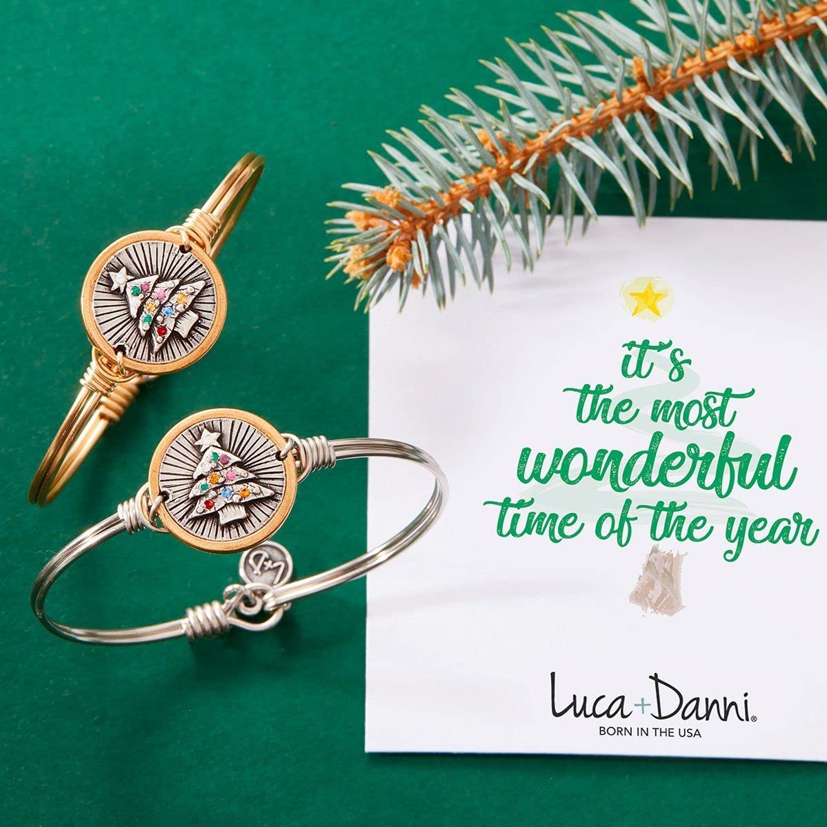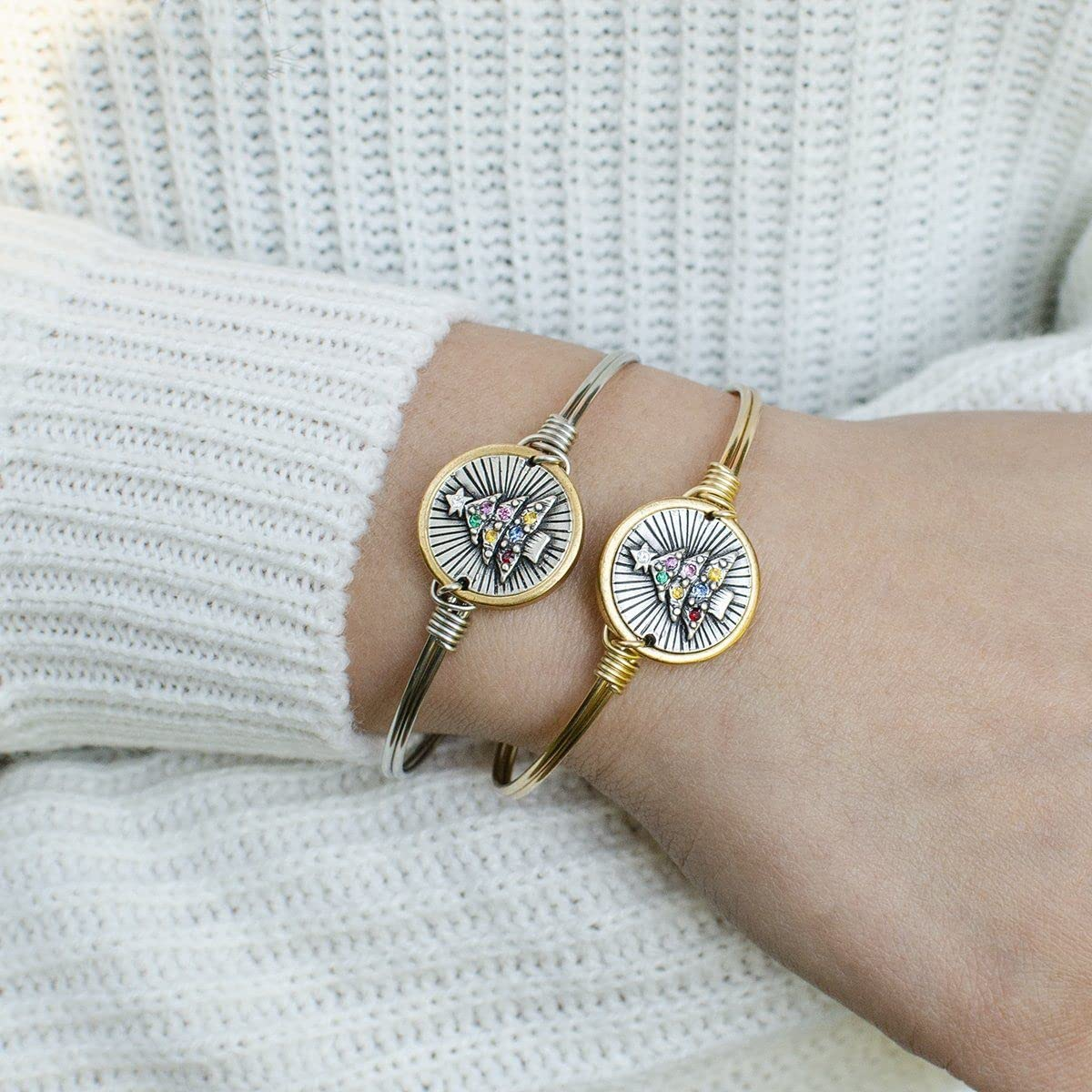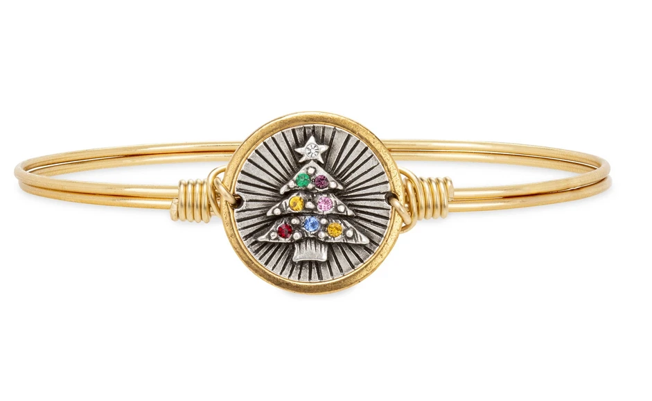 Channel perennial good vibes in this ever-thriving symbol of the season. Every detail shines in this holiday tree bangle complete with sparkling multicolored ornaments.