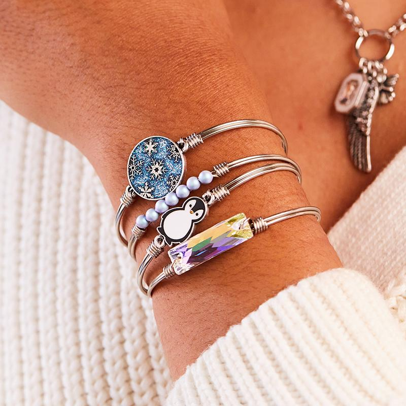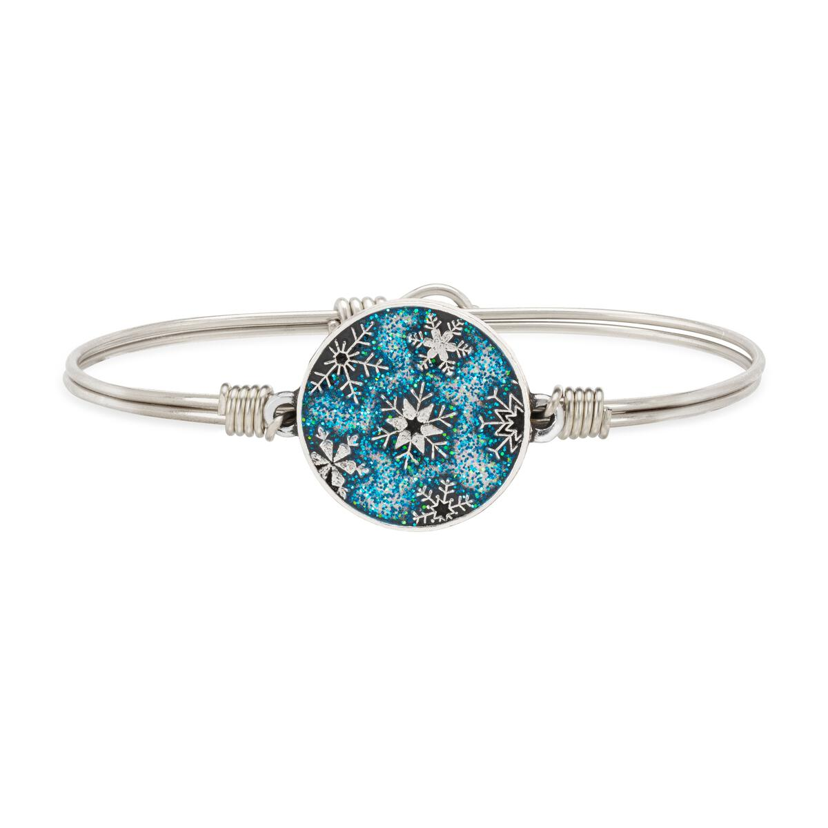Make it a (uniquely) magical moment in this handcrafted Snowflake Bracelet featuring a whirlwind of icy designs. Six distinctive snowflake shapes dance on a round medallion centerpiece finished with a glittering blue enamel backdrop.