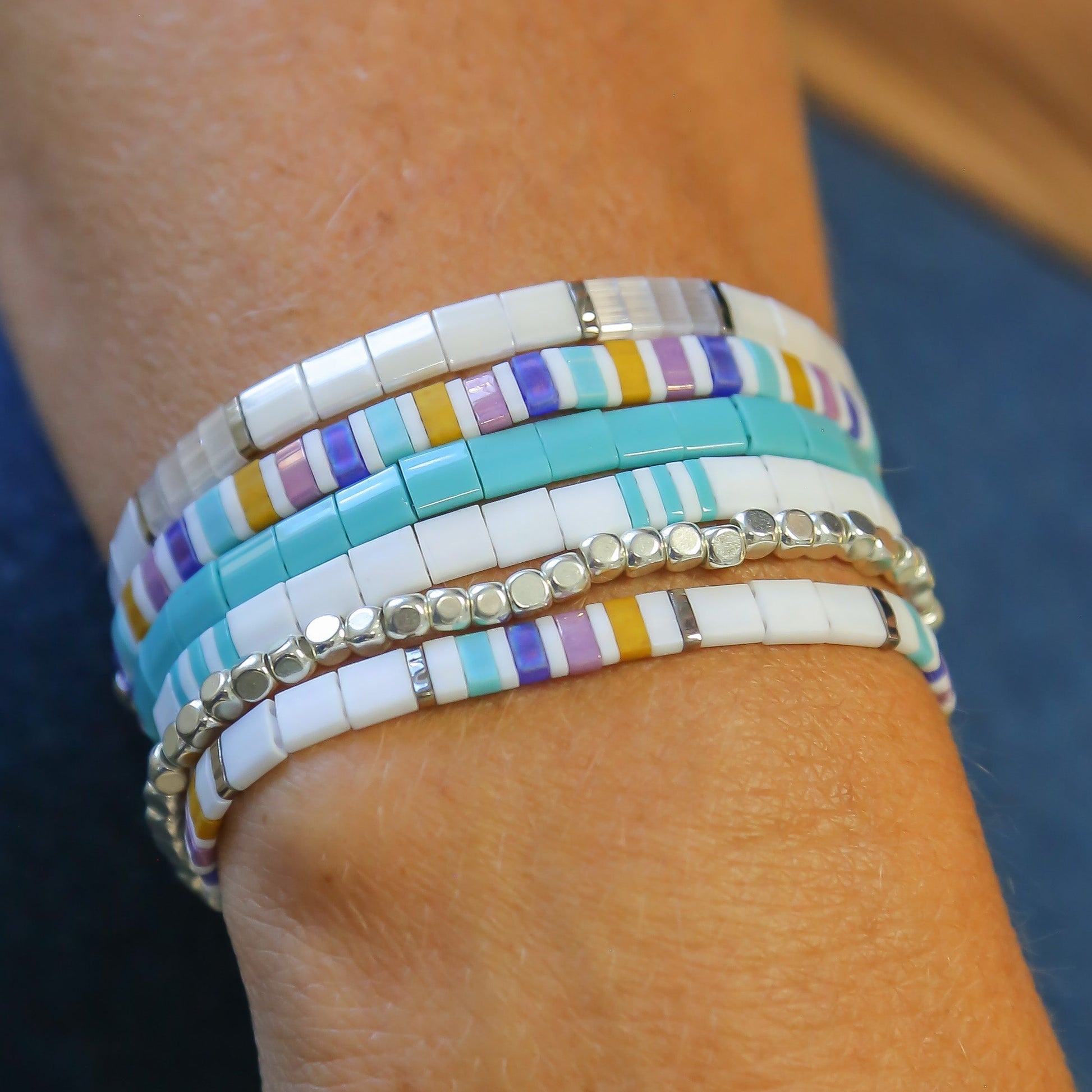 Our MAUI stack includes SIX Total bracelets! (Yes, 6!!) Included in the stack are 5 tila bracelets with bright colors of mustard, turquoise, white, silver and two different tones of purple. The sixth bracelets is cute cube bracelet which is only comes in one size (which should fit most people)