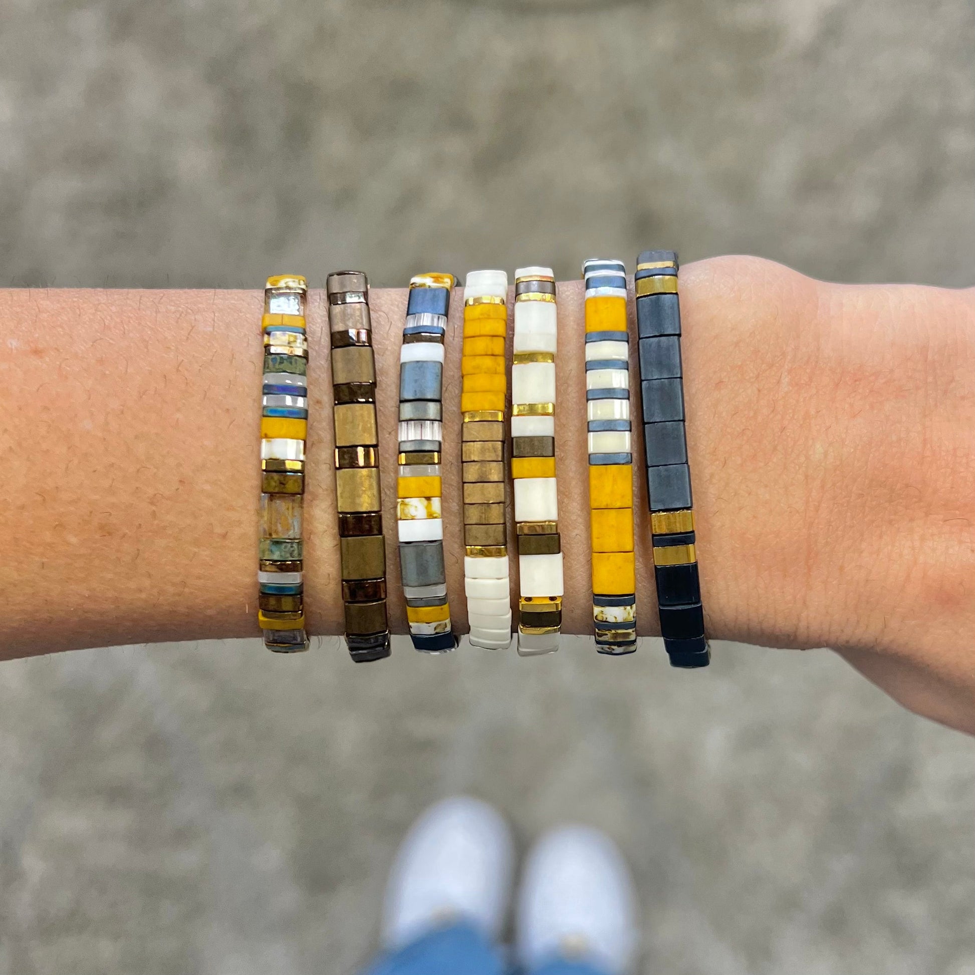 Our OUTPOST stack includes seven total bracelets! (Yes, 7!!) Included in the stack are 7 tila bracelets with gorgeous colors of Dirty Teal, Navy Blue, White, Orange, Bronze, and Gold.