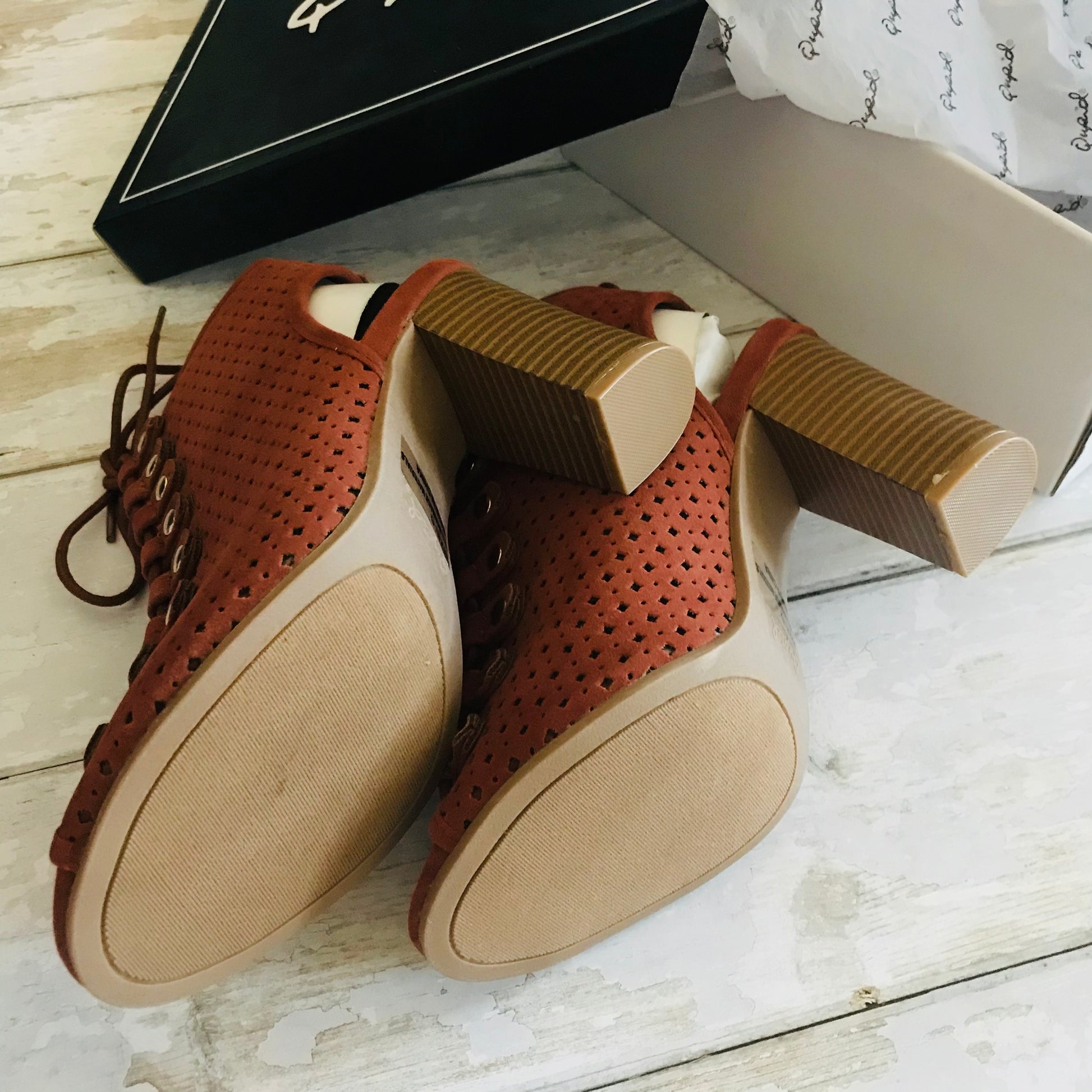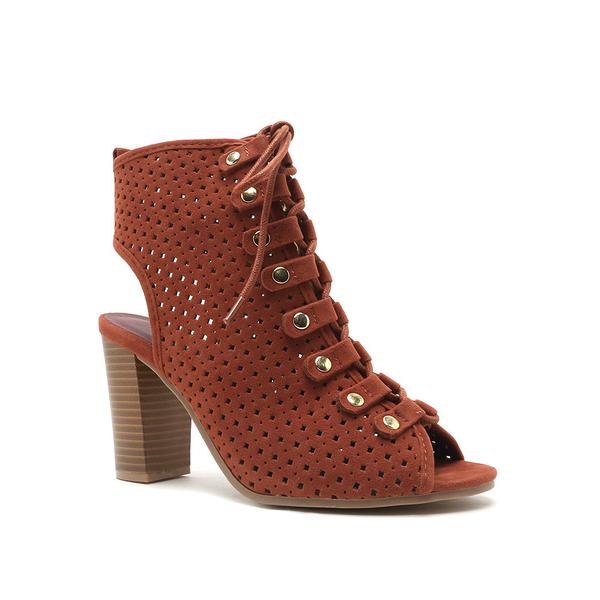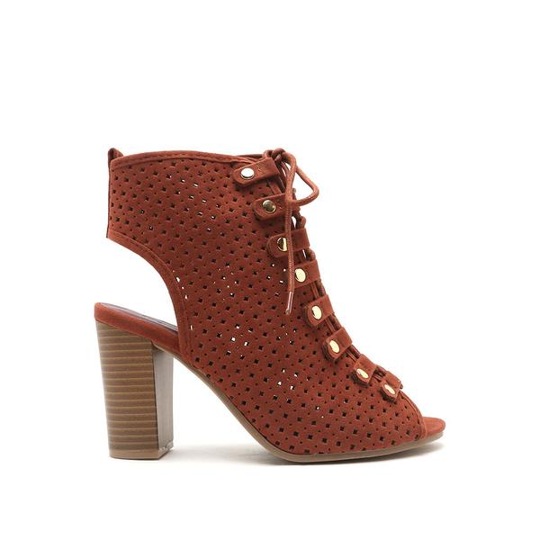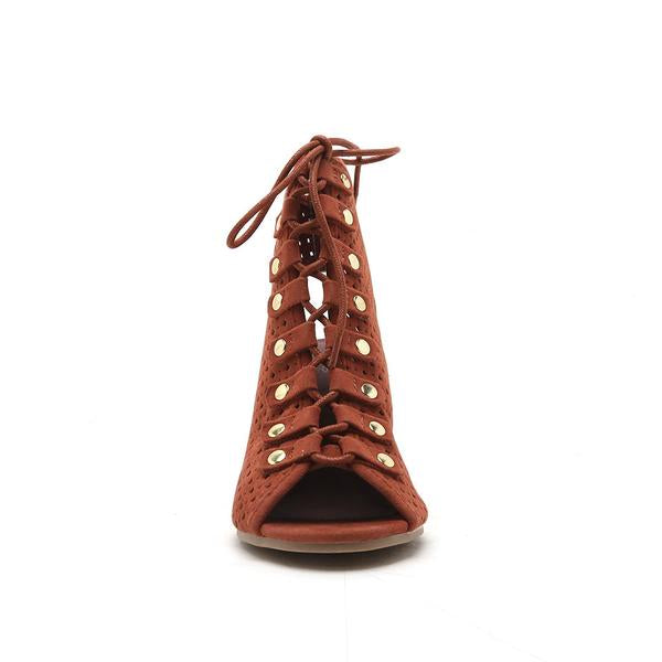 Features a suede leatherette upper, peep toe front, open heel cup, silver button embellishments, and perforation detail. Lightly padded insole for your comfort and support.