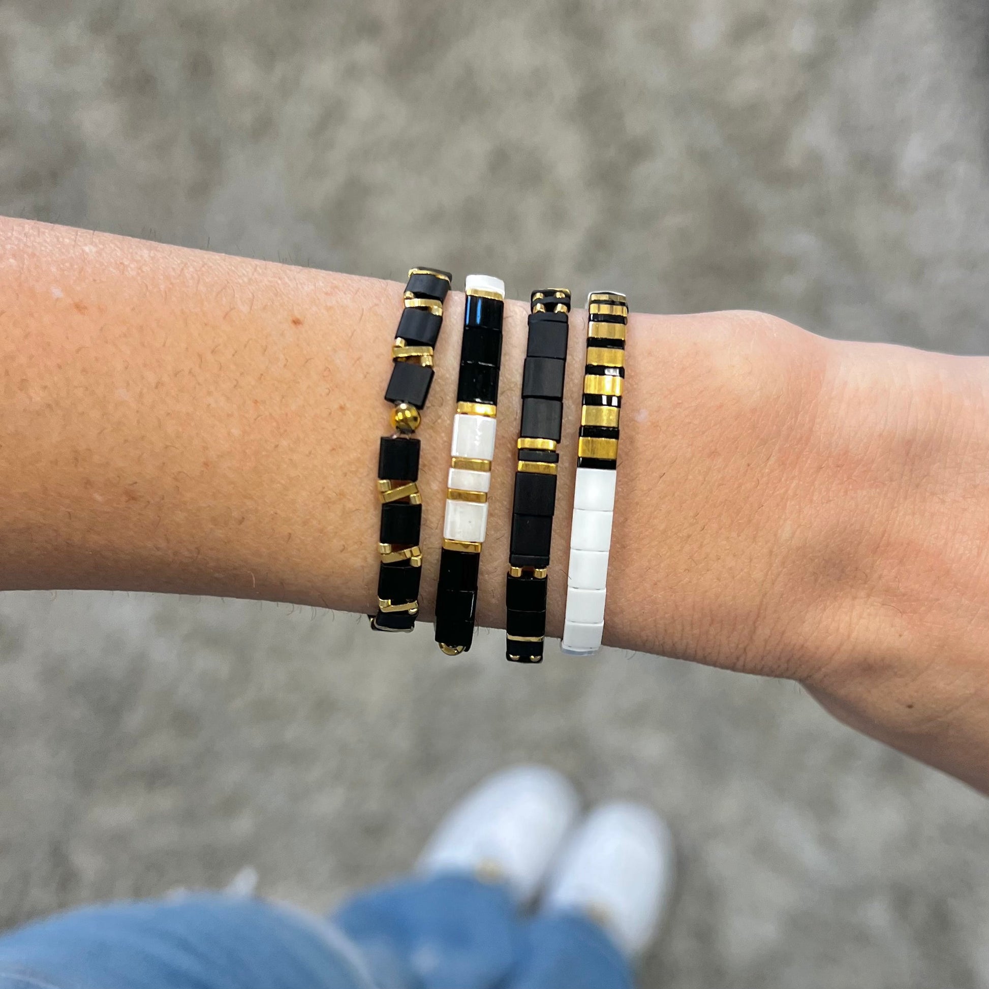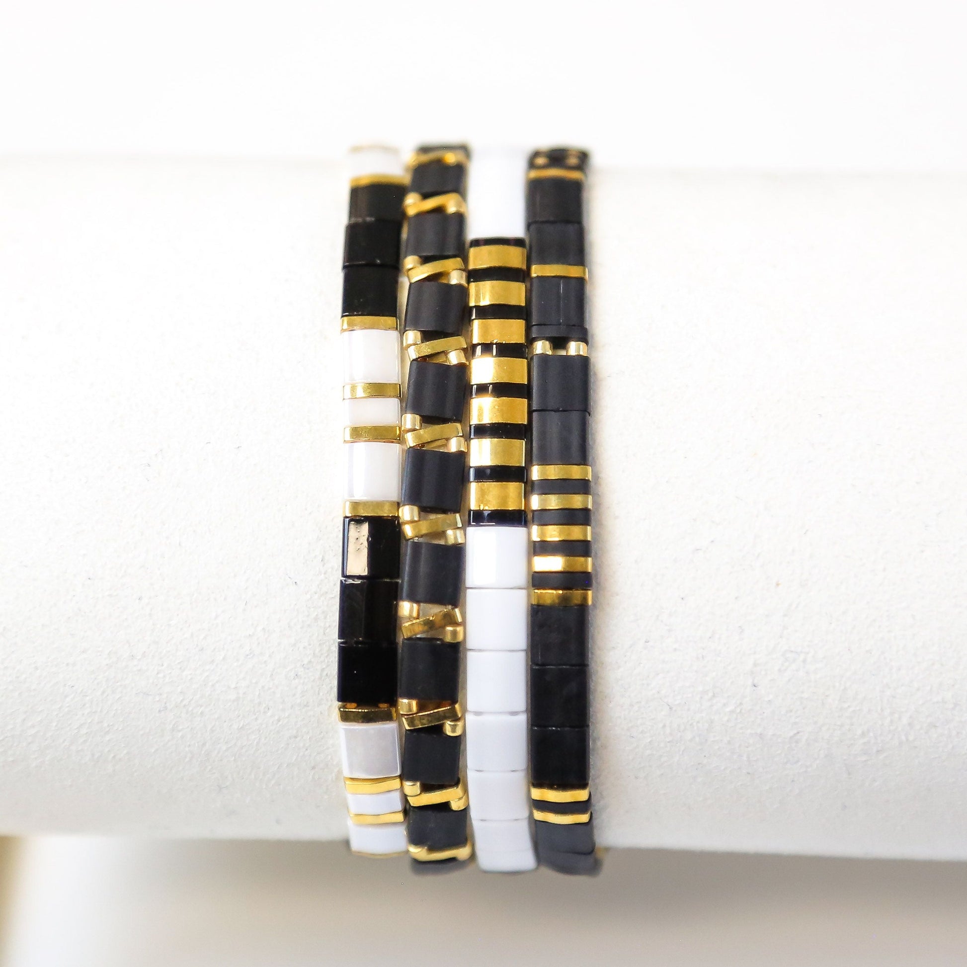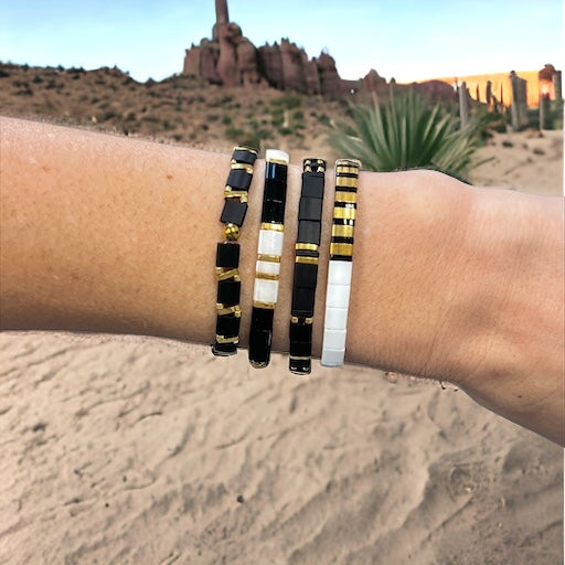 Our PHAROAH stack includes four total bracelets! (Yes, 4!!) Included in the stack are 4 tila bracelets with gorgeous colors of White, Black, and Gold.