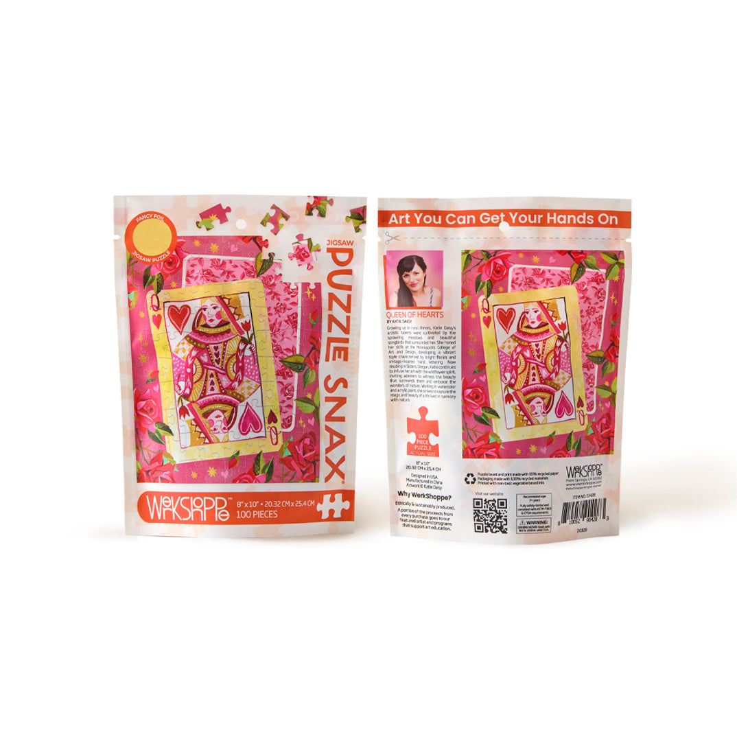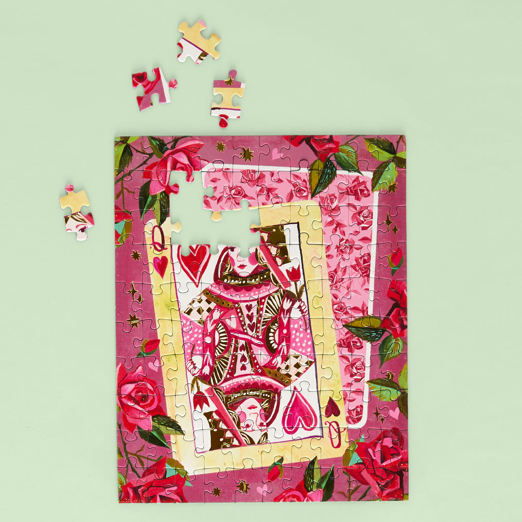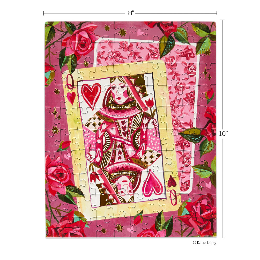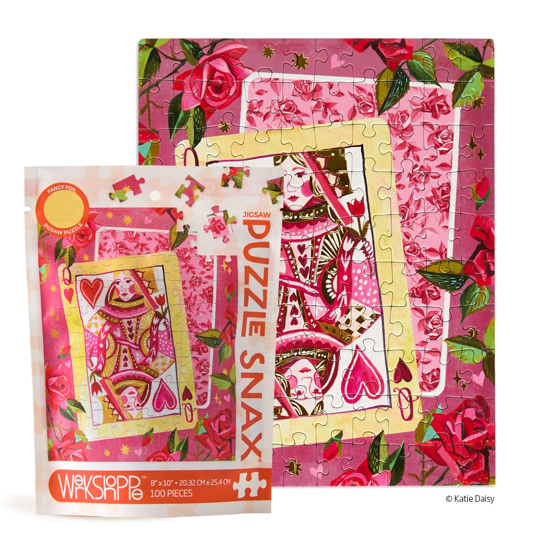 The iconic Queen of Hearts playing card atop a rose background makes this 100-piece Puzzle Snax a great single sitting activity.