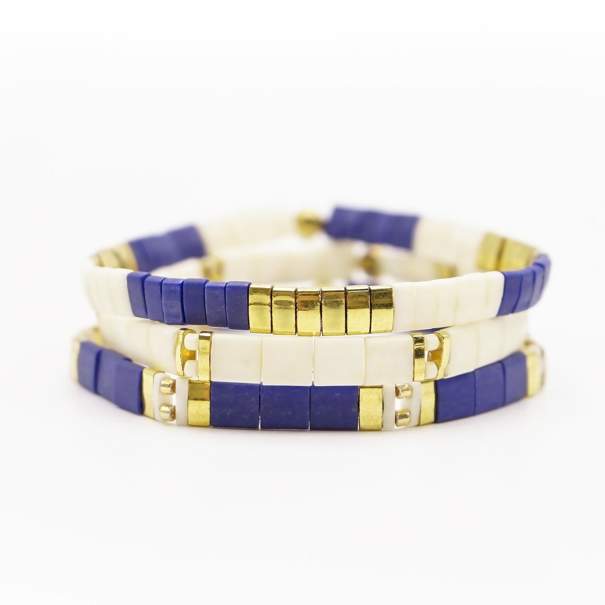 Our handmade royal blue bracelets are classy & elegant. You’ll find a touch of gold and cream laced throughout this bracelet. Very rich colors!