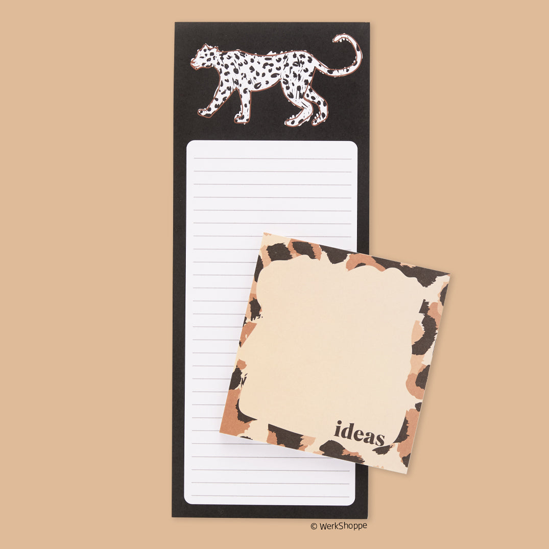 A classy set of exotic big cat patterns adorn this magnetic list pad and mini note pad for ideas on the go.