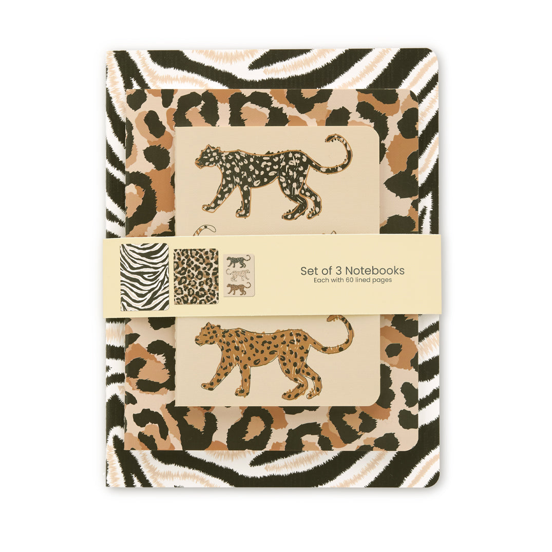 Jungle cats and their beautiful patterned coats of stripes and spots make this an attractive set of 3 coordinating and graduating in size stitched notebooks for everyday use.