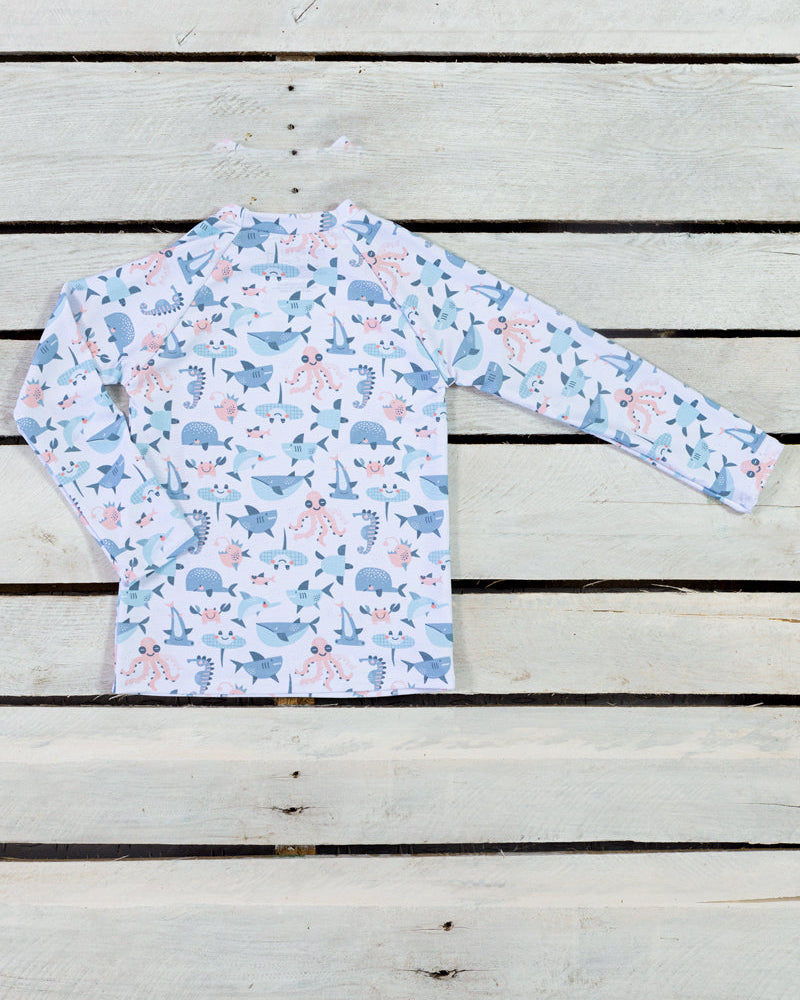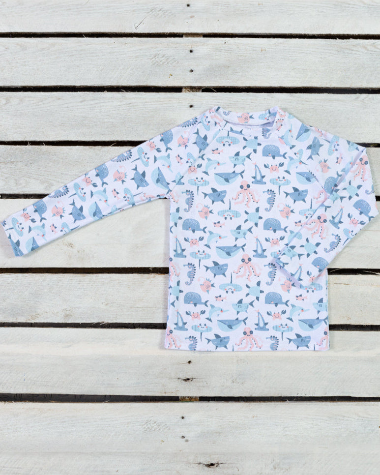 Sharks, Crabs and Octopus, oh my! Your sea-life loving little one will be ready for the beach, pool or lake in this Sealife theme Sun Shirt. Made of ultra-soft UPF 50+ fabric in navy gingham, topped off with a white zipper. Proudly made in the USA.