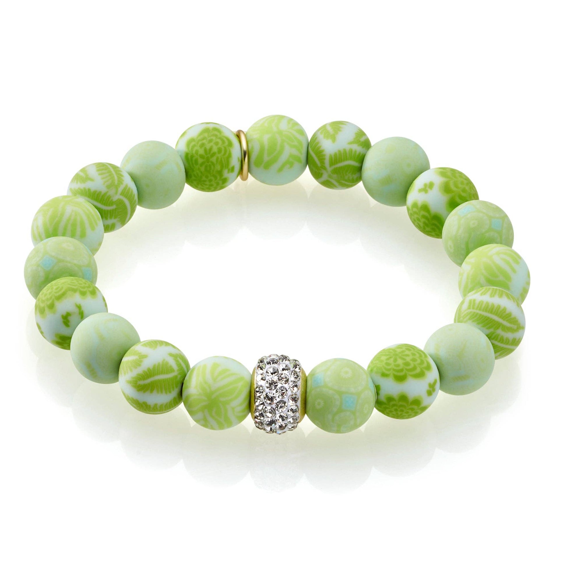 Additional Details: * Handcrafted 10mm polymer clay beads with 10mm Crystal center bead * Brilliant matte gold plating features e-coating to help guard against wear and tarnishing * Lead-free, nickel-free, and cadmium-free * Elastic stretch style * One size fits most.