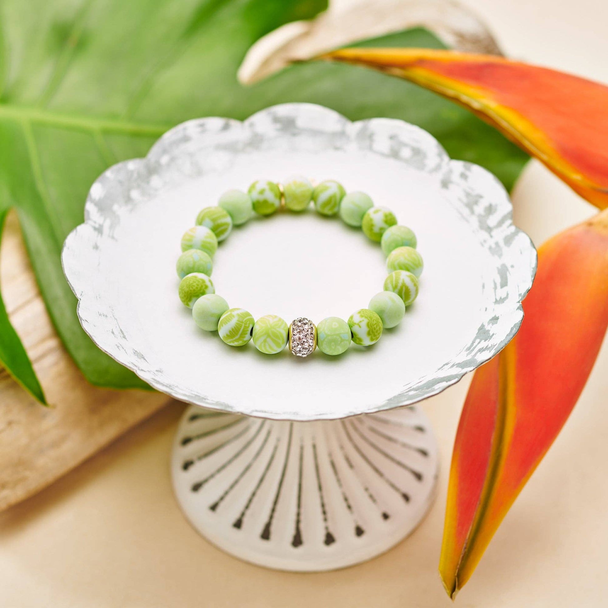 Beautiful handmade beads complement a bright crystal centerpiece to add sparkle and color to your day! Seaside Green is a whimsical palette of leafy greens and turquoise blues inspired by gentle lapping waves on a sun-kissed shore.