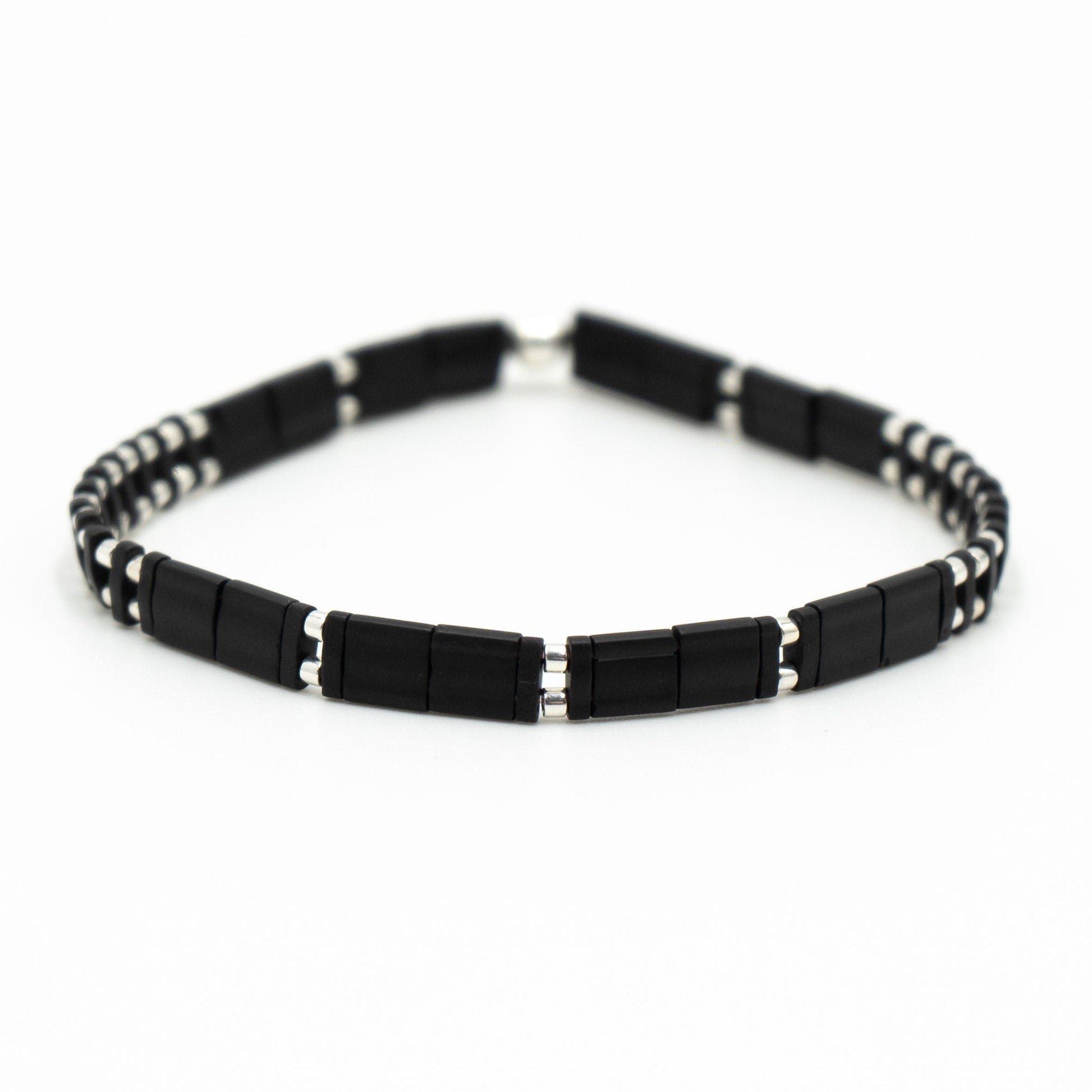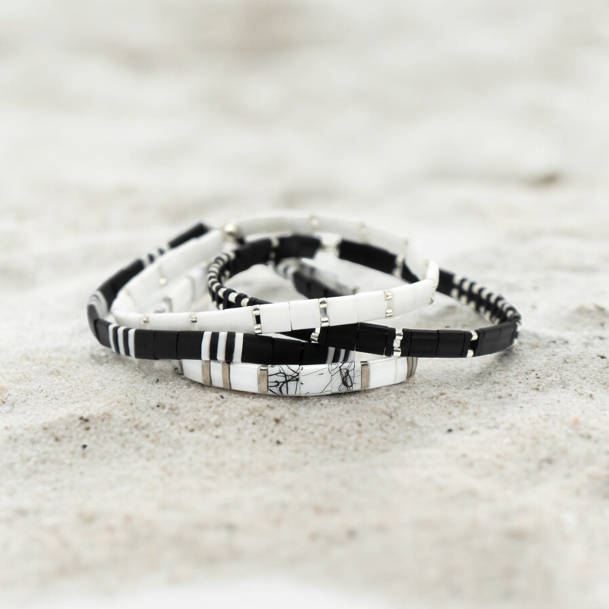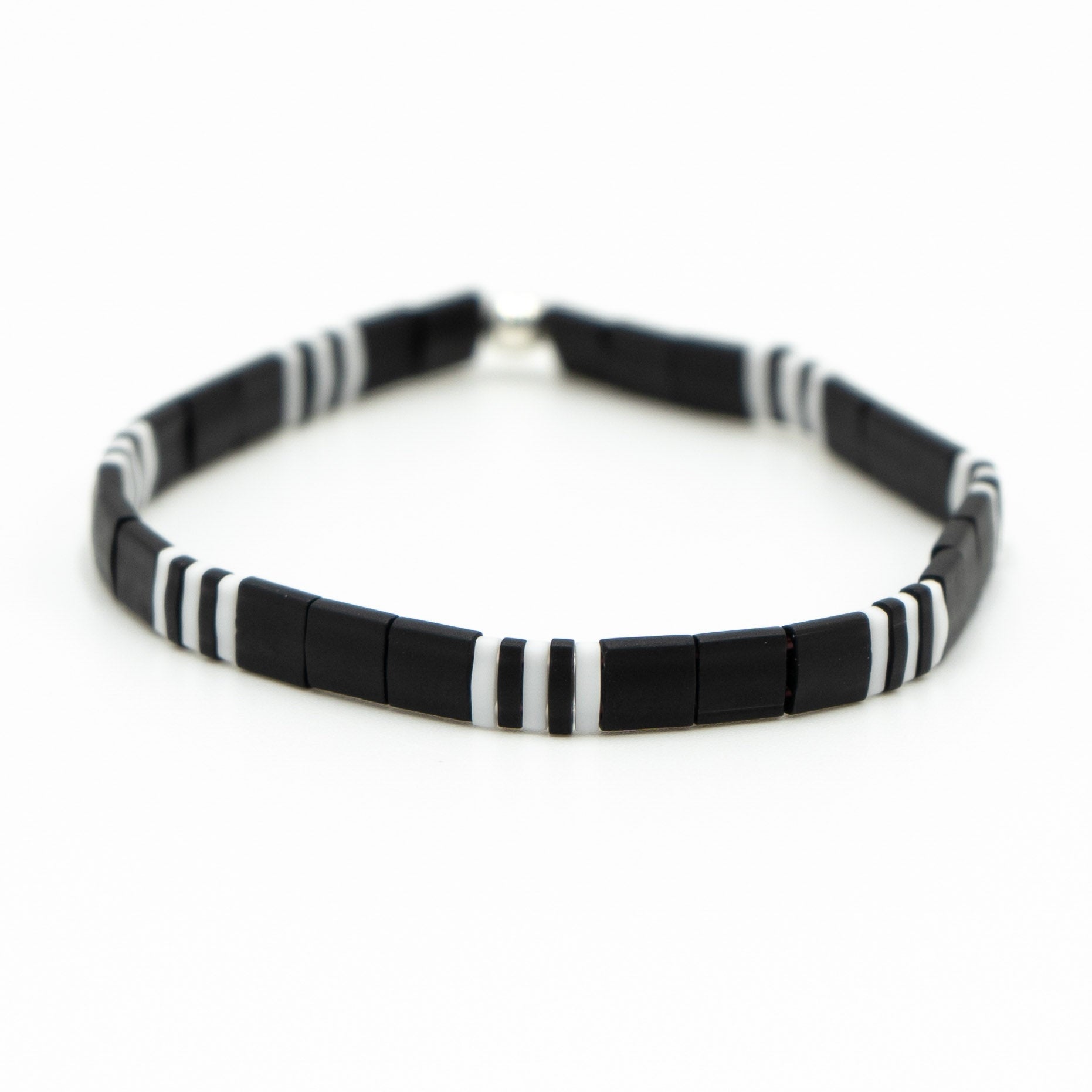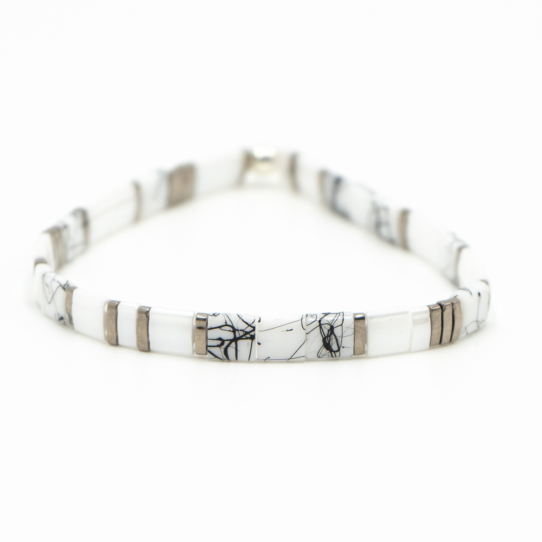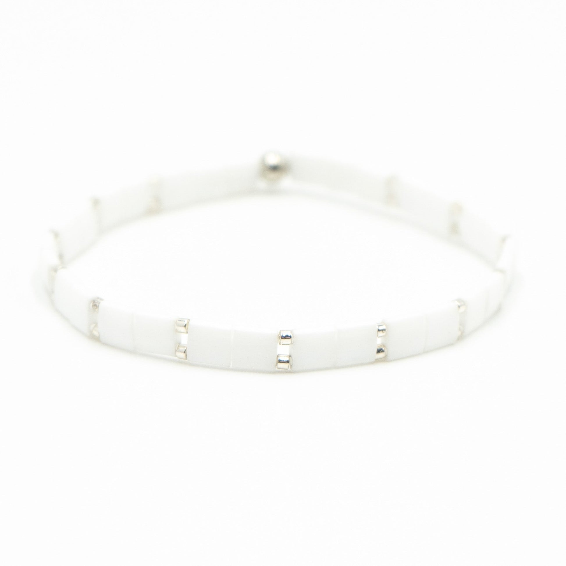 Our tila bead bracelets are handmade in Utah, and are made once your order is placed. We use a very expensive crystal elastic cord that is clear in color. We use the highest quality beads from a manufacturer based out of Japan, known as one of the best glass bead producers in the world. The tila beads themselves are small, flat, 2-hole glass beads, or glass tile beads. The square tile beads are about 5mm in size. When finishing our bracelets, we knot them multiple times AND glue them. We use E6000 glue, one of the best glues for beading and fabrics. Multiple years of experience has gone into the strength & stretch of elastic we use, hot tight to tie the knots and finding the highest quality and best colors of beads, and best way to finish them to ensure they last as long as possible!