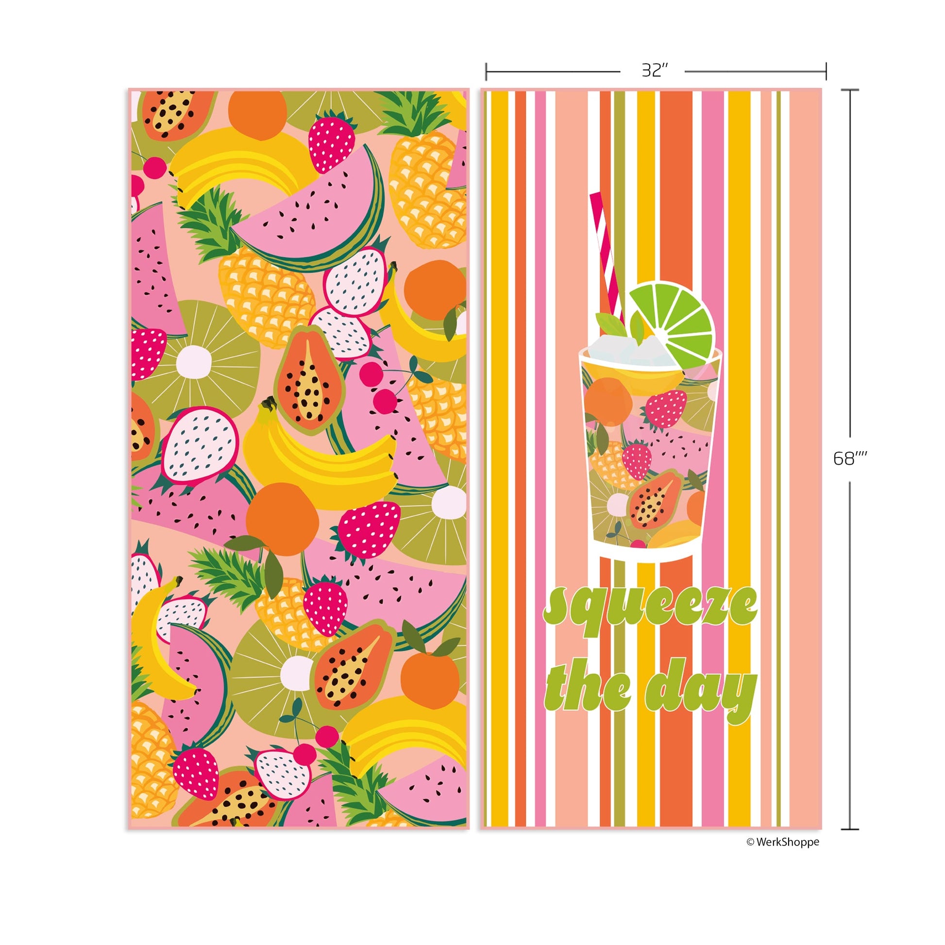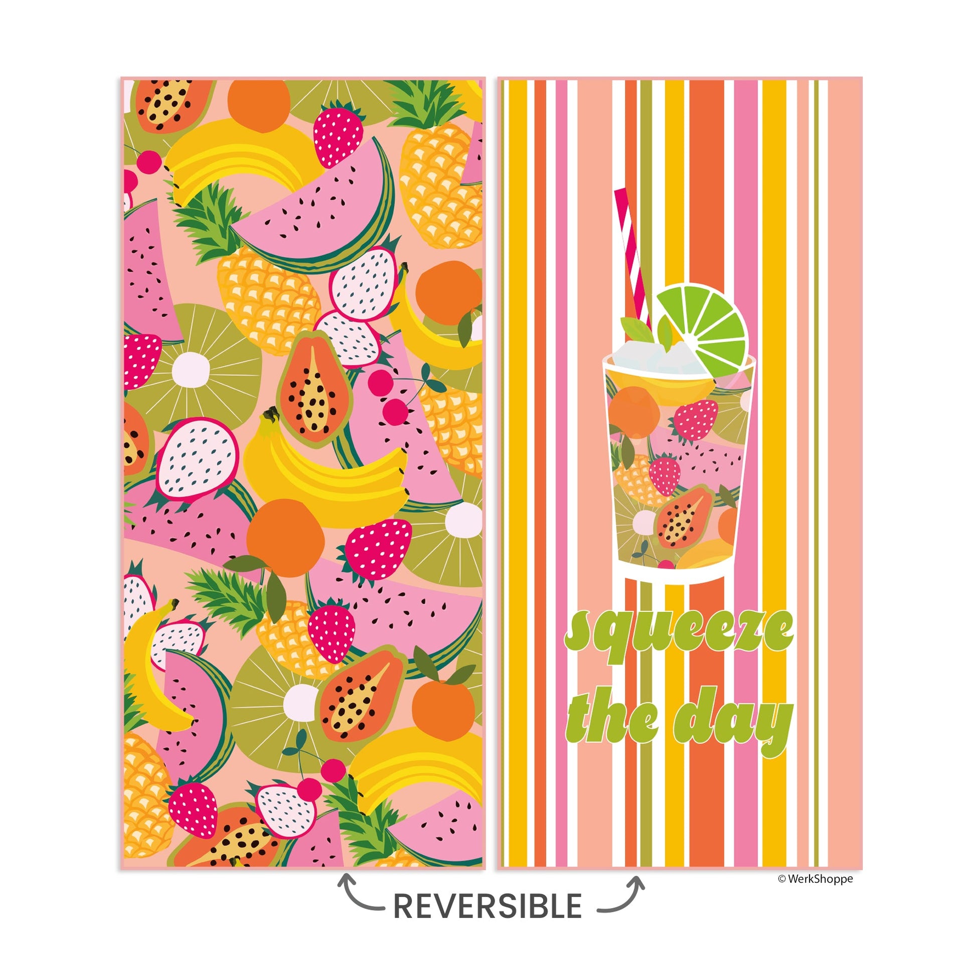 A mixed fruit collage print flips over to a coordinating stripe with welcoming drink and fun saying on this reversible microfiber Go Big beach towel.