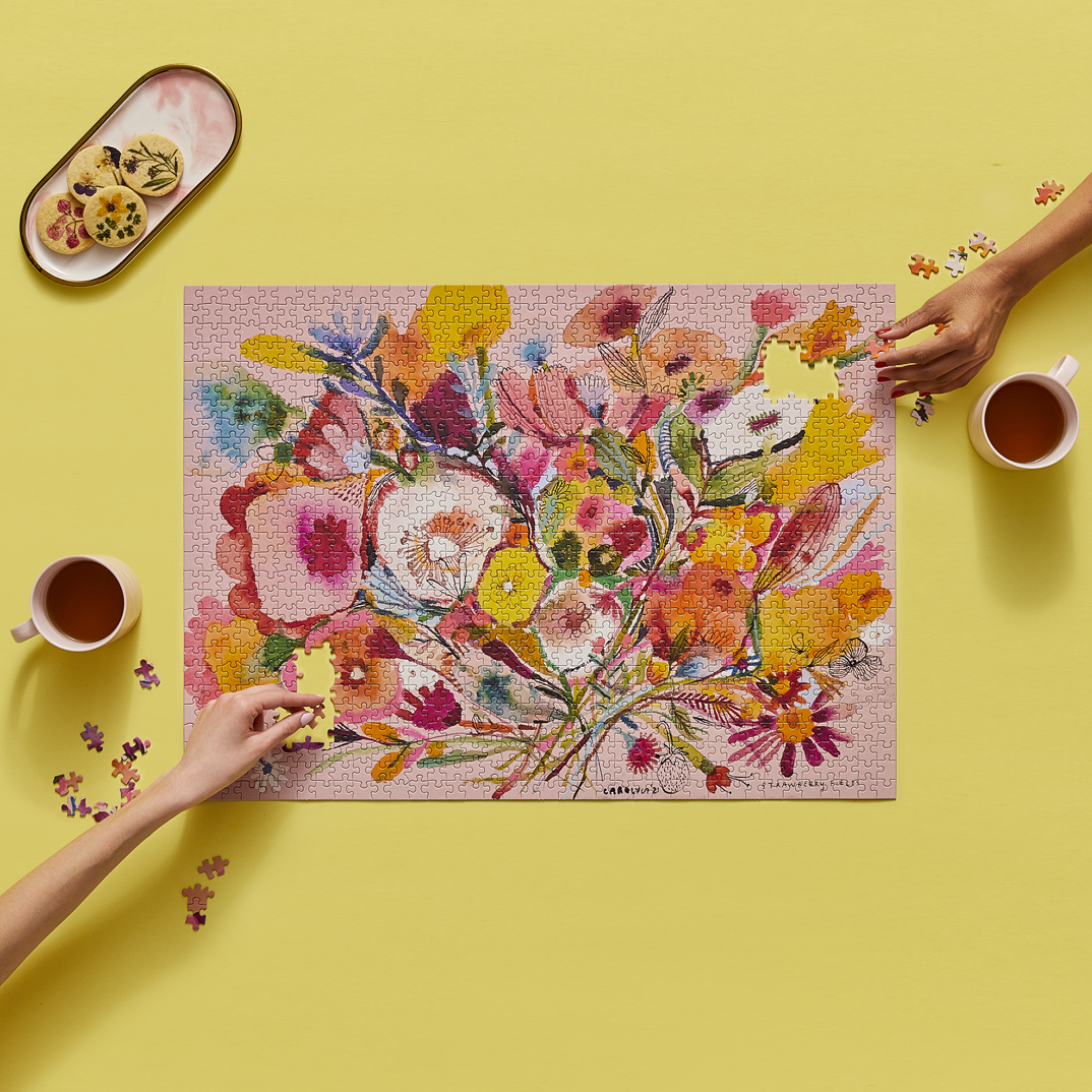 With a bright pink bouquet of vibrant flowers, this puzzle makes you feel happy. Painted by Carolyn Gavin, this puzzle makes the perfect hostess, birthday or anniversary gift.