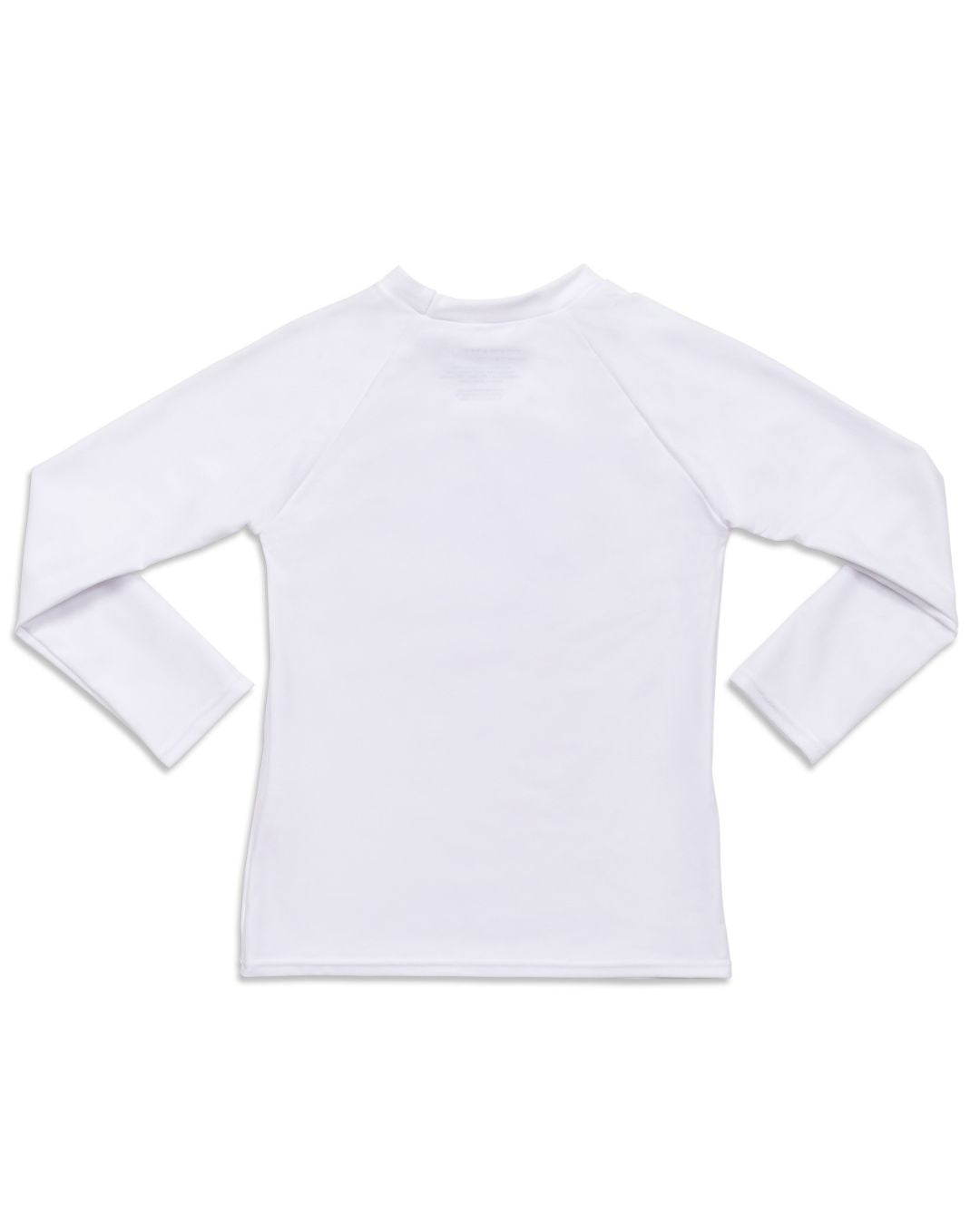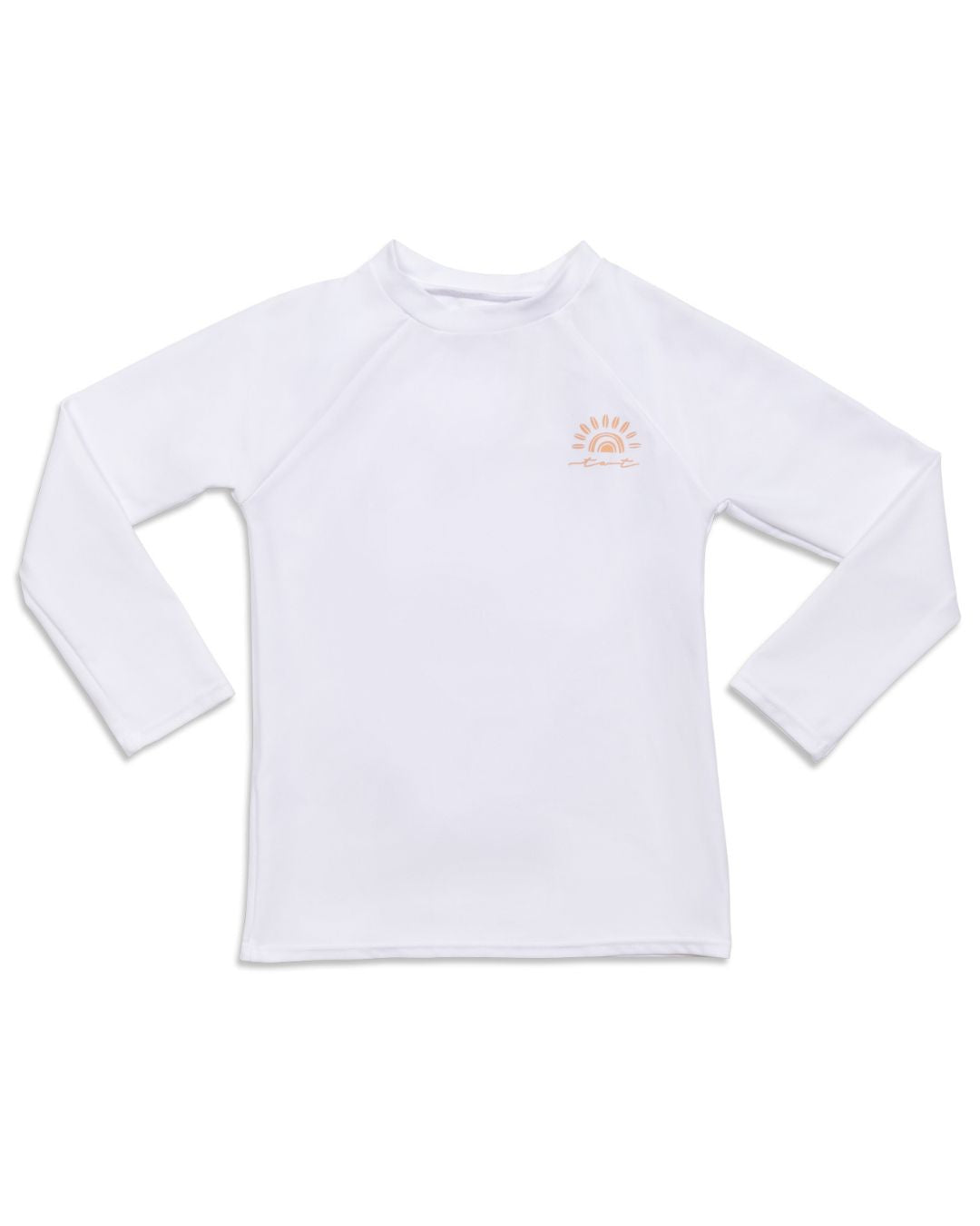 Your tot will be ready for all the fun under the sun! This long Sleeve UPF 50+ sun shirt made of soft, white spandex with tan sun and twt emblem on the chest, proudly made in the USA