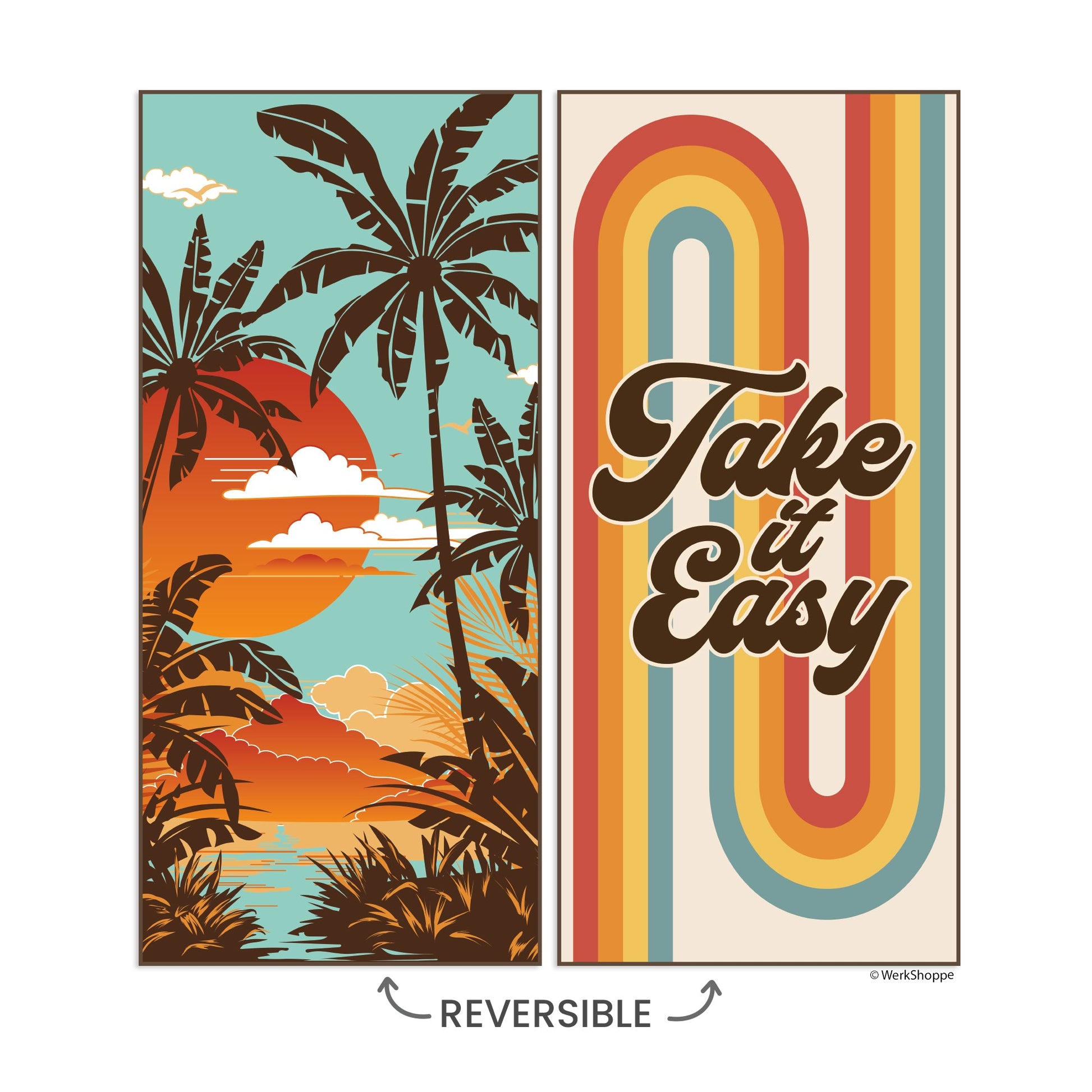 A retro graphic design with words to live by pairs up perfectly with a scenic sunset beach image on this reversible microfiber Go Big Beach towel.