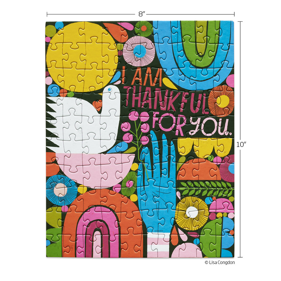 "Thankful For You" by Lisa Congdon is a brightly colored modern 100 piece puzzles. In an on-the-go resealable pouch, this puzzle is ready for travel.