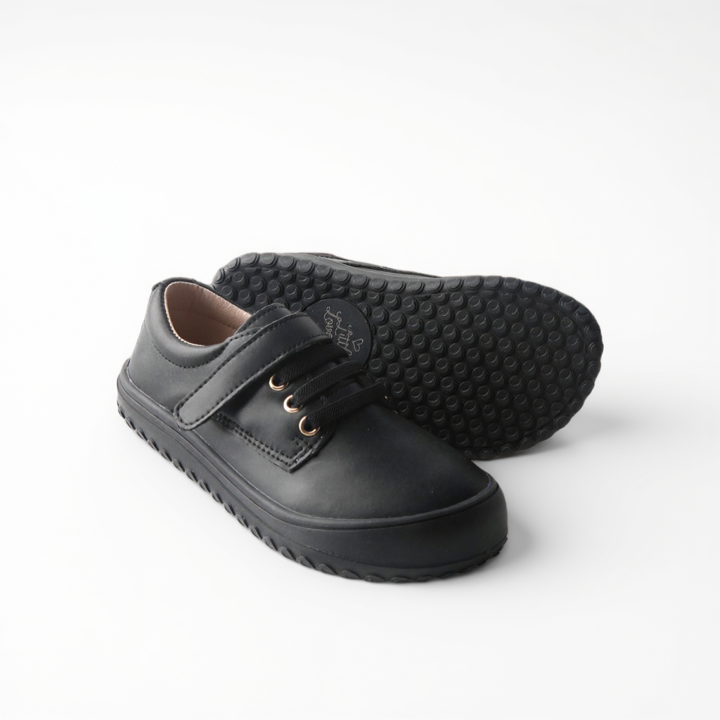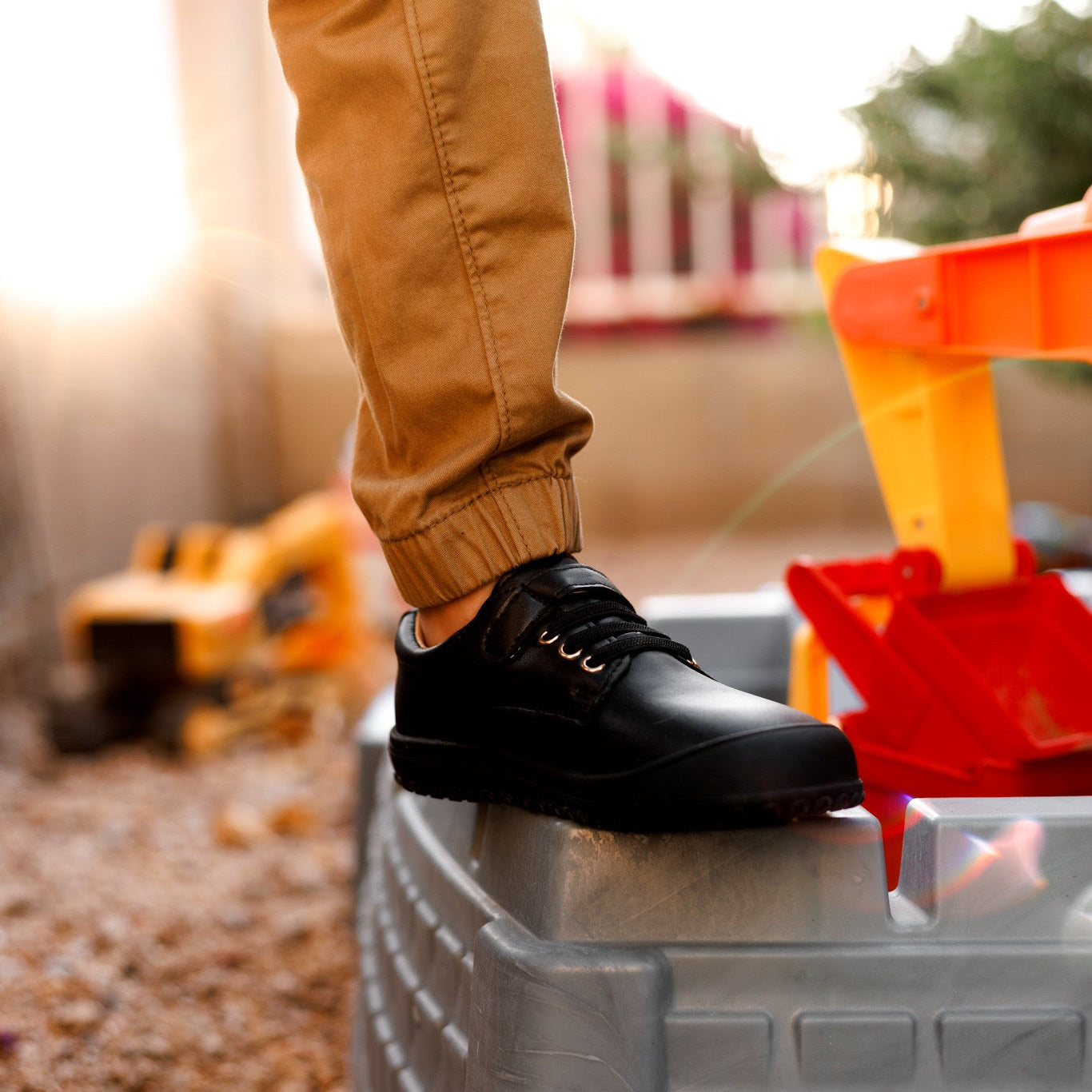 Our Latest Line of Play Perfects! Designed with active school days in mind, these barefoot-style shoes are built to withstand playground adventures. Available in sizes up to children's size 3, they feature a flat, flexible sole, wide toe box, and genuine leather for durability and style.