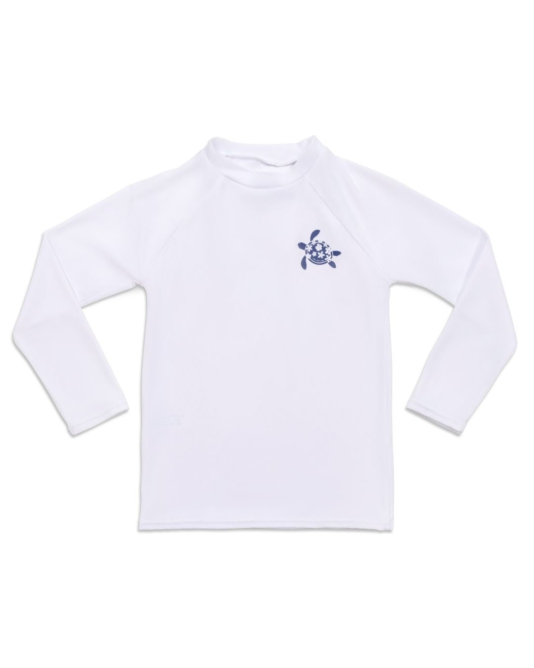 A collection that is almost cute as your tot this is white long sleeve un shirt that is made of UPF 50+ fabric with a turtle emblem on the shirt.