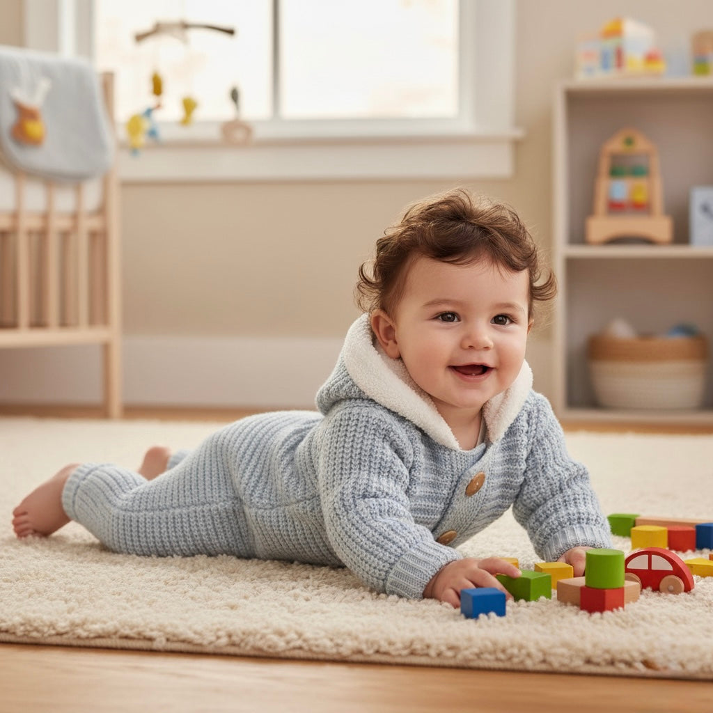 This Sherpa-lined blue knitwear hooded one-piece is the perfect winter essential for your little one! With its soft knit exterior, cozy Sherpa lining, and cute button-up design, it's the ultimate combination of comfort and style. The hood adds extra warmth for those chilly days, making it ideal for outdoor adventures or snuggling up indoors.