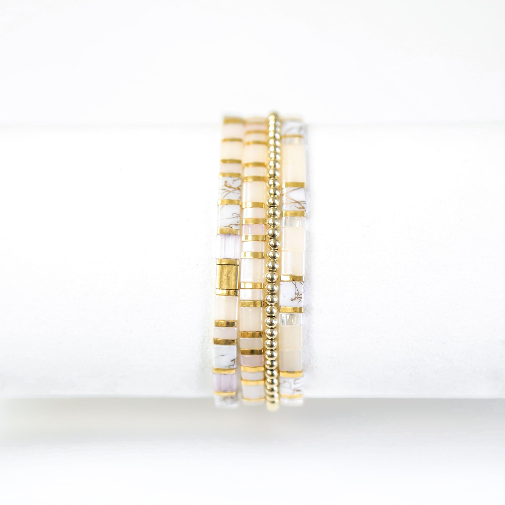 Our ALLURE stack includes four total bracelets! (Yes, 4!!) Included in the stack are 3 tila bracelets with gorgeous colors of White Marble, Coconut and Gold. It also includes a gold filled bead bracelet.