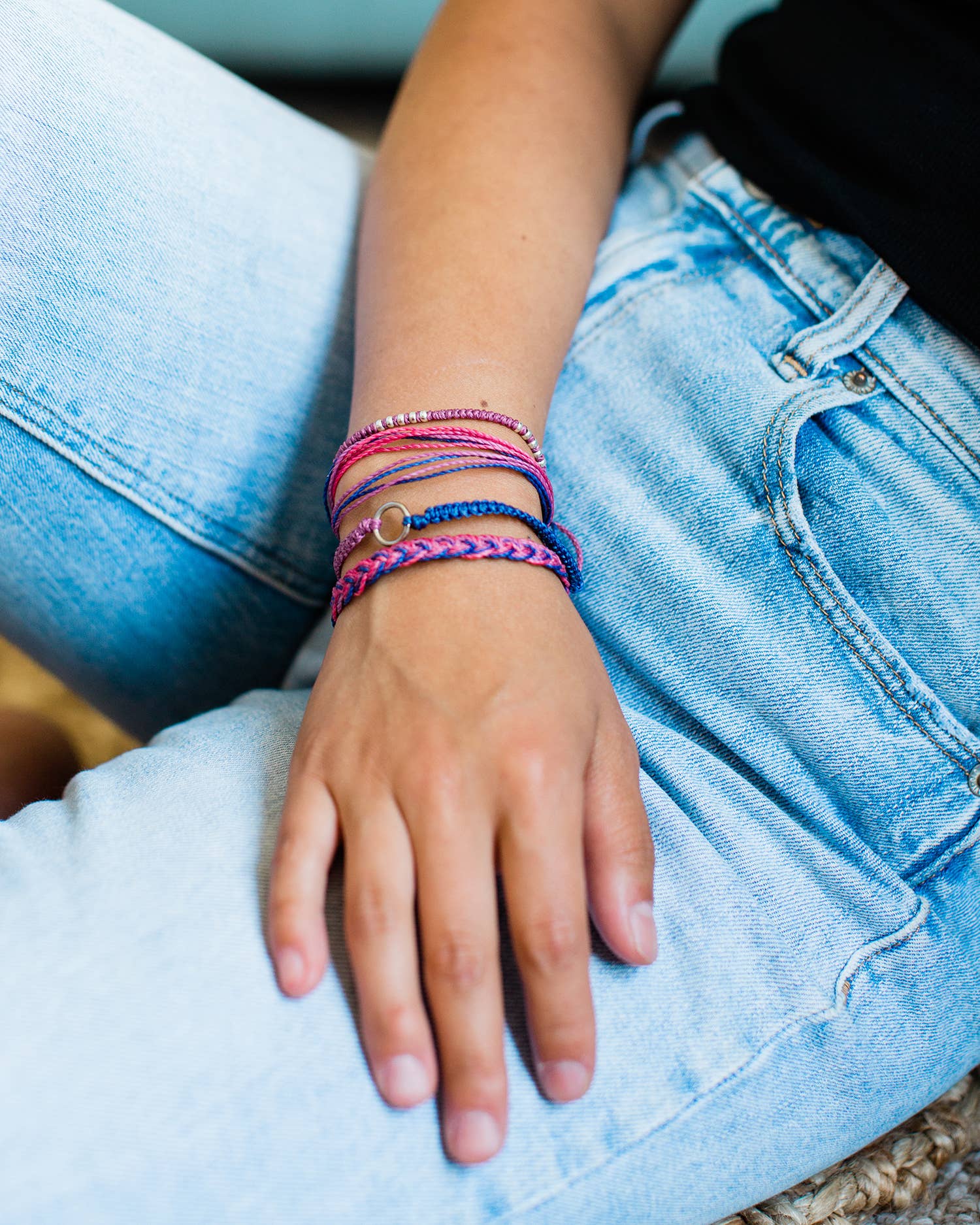 Earth, Wind, Fire, and Water in Blackberry. This set of 4 Blue and Pink bracelets comes on a merchandising card with one of each element so you can layer to your liking! Each purchase empowers Artisans in Guatemala.