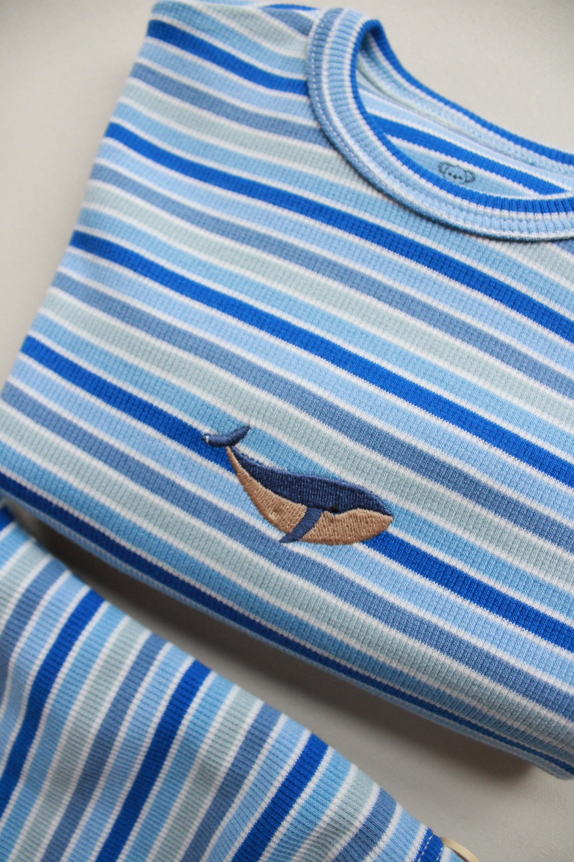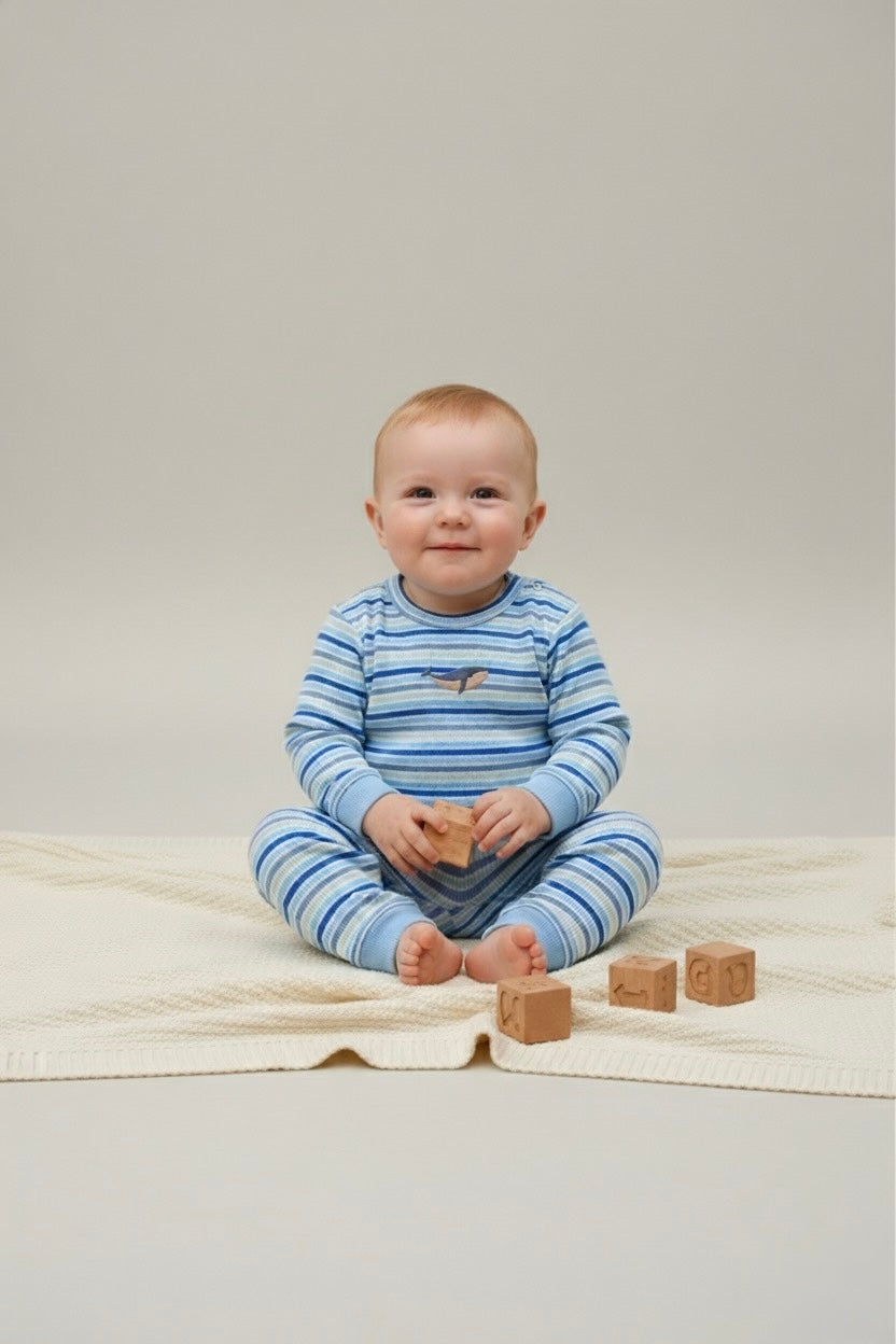 Sail into comfort with the Blue Whale Two-Piece Set, made from soft, breathable cotton for little adventurers. This cozy outfit features a long-sleeve top with blue and white stripes, a sweet embroidered whale, and matching pants for a snug fit. Gentle on baby’s skin, easy to wear, and perfect for playtime or lounging. Ethically made in Turkey.