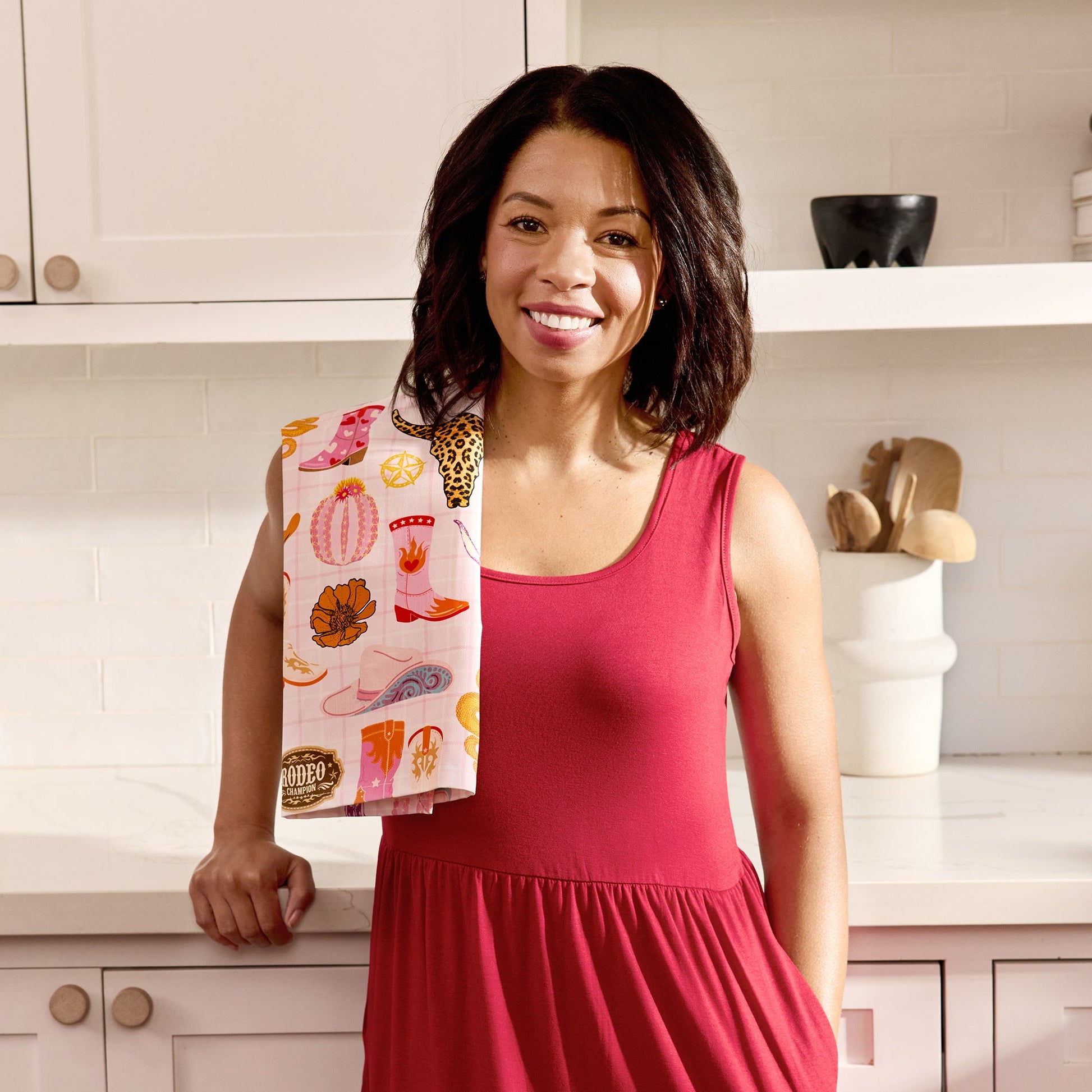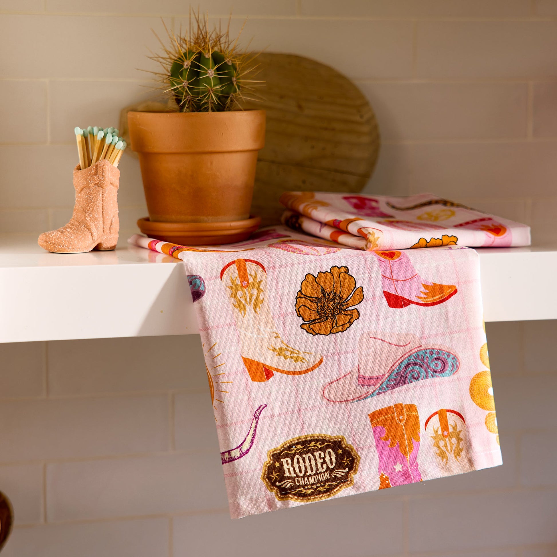 This 100% cotton tea towel illustrating western icons is sure to be a favorite with those who have that special cowgirl attitude, style, and grit.