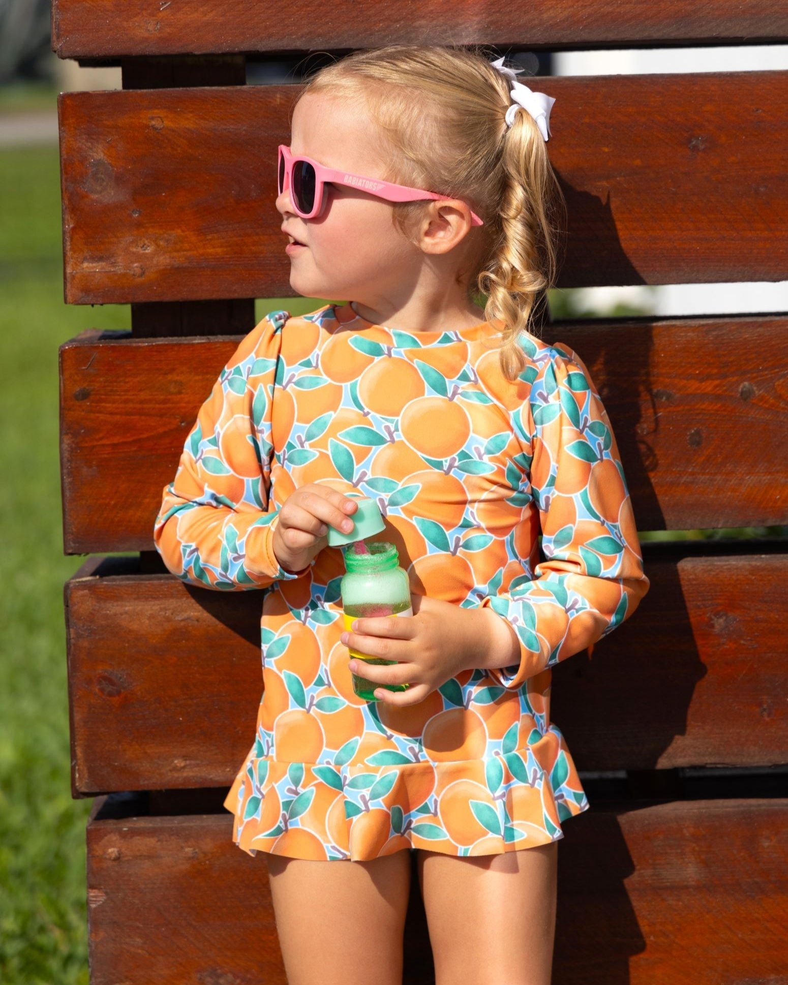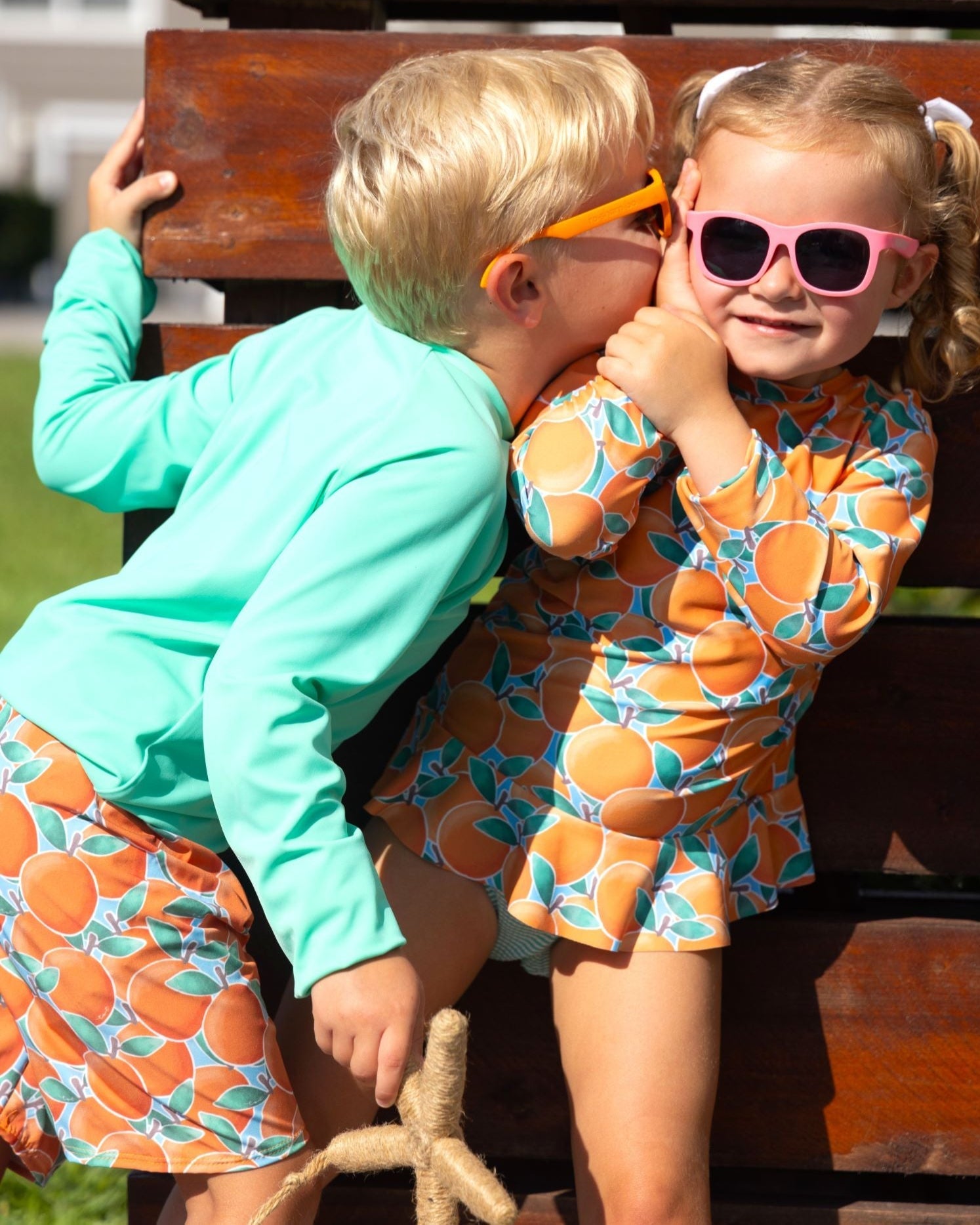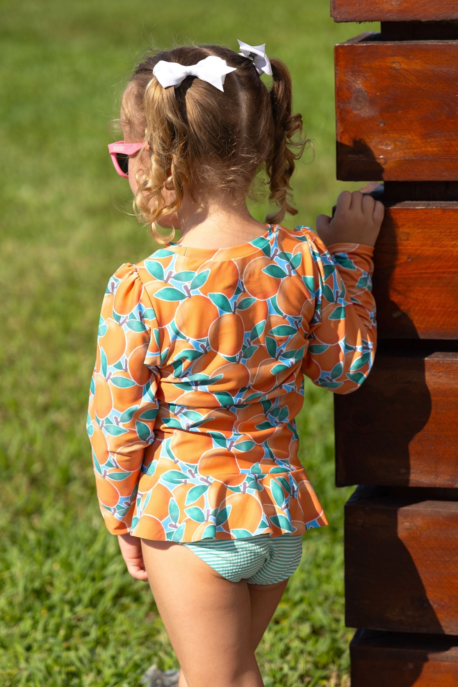 Your little one will put the cute in this Cuties Collection! This two piece set includes our girls long sleeve ruffle shirt with our fan favorite seafoam pinstripe lined bottoms! As Always all our suits are made with UPF 50+ fabric and made in the USA!
