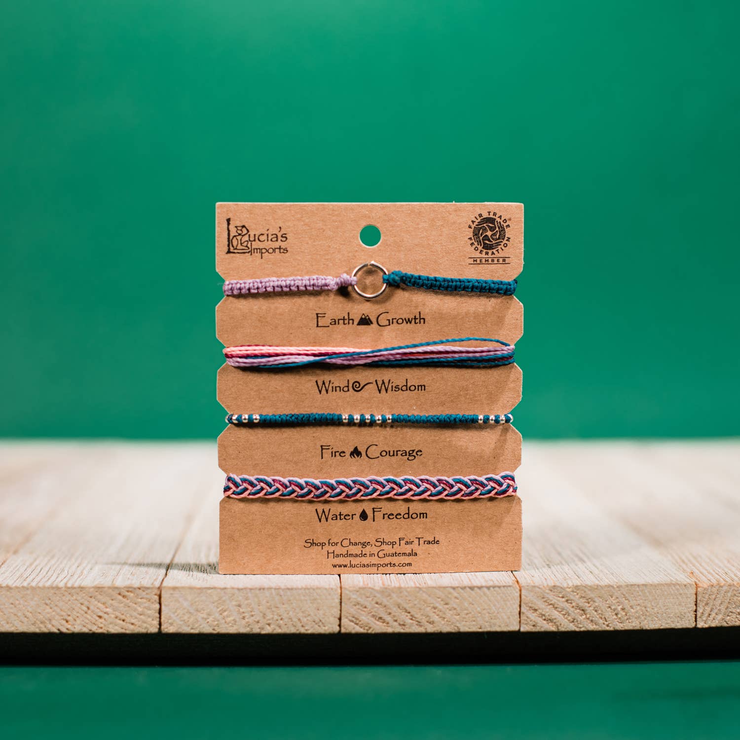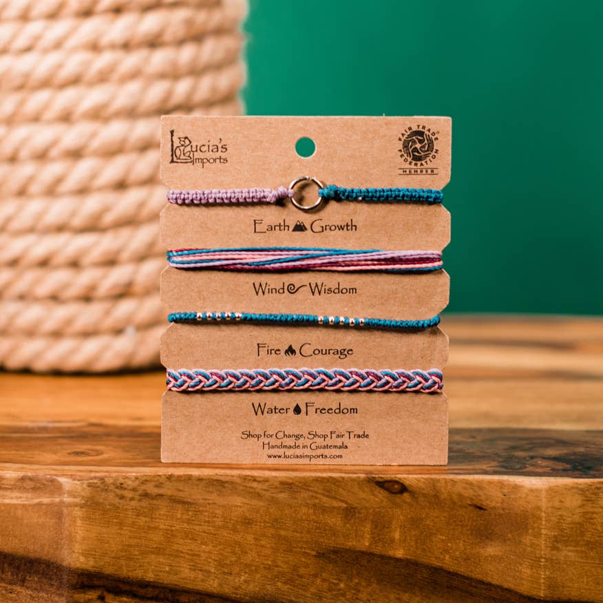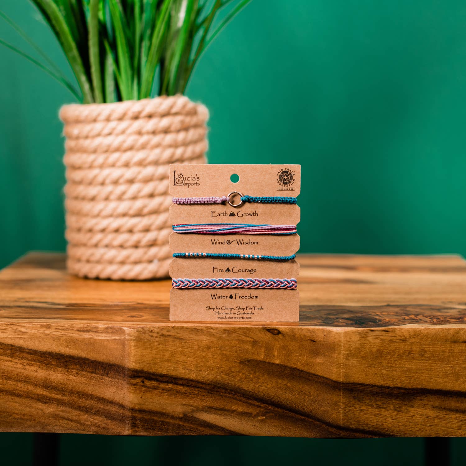 The newest addition to our element bracelet sets features 4 stacking bracelets, each representing one of the four major elements, Earth, Wind, Fire and Water. This elderberry set features deep blue and purples eluding to the healing properties and soothing colors of the elderberry. Each bracelet features an adjustable slip knot closure for easy wear. Mix and match the bracelets for a fun stack or wear them separately. Each purchase empowers Guatemalan artisans.