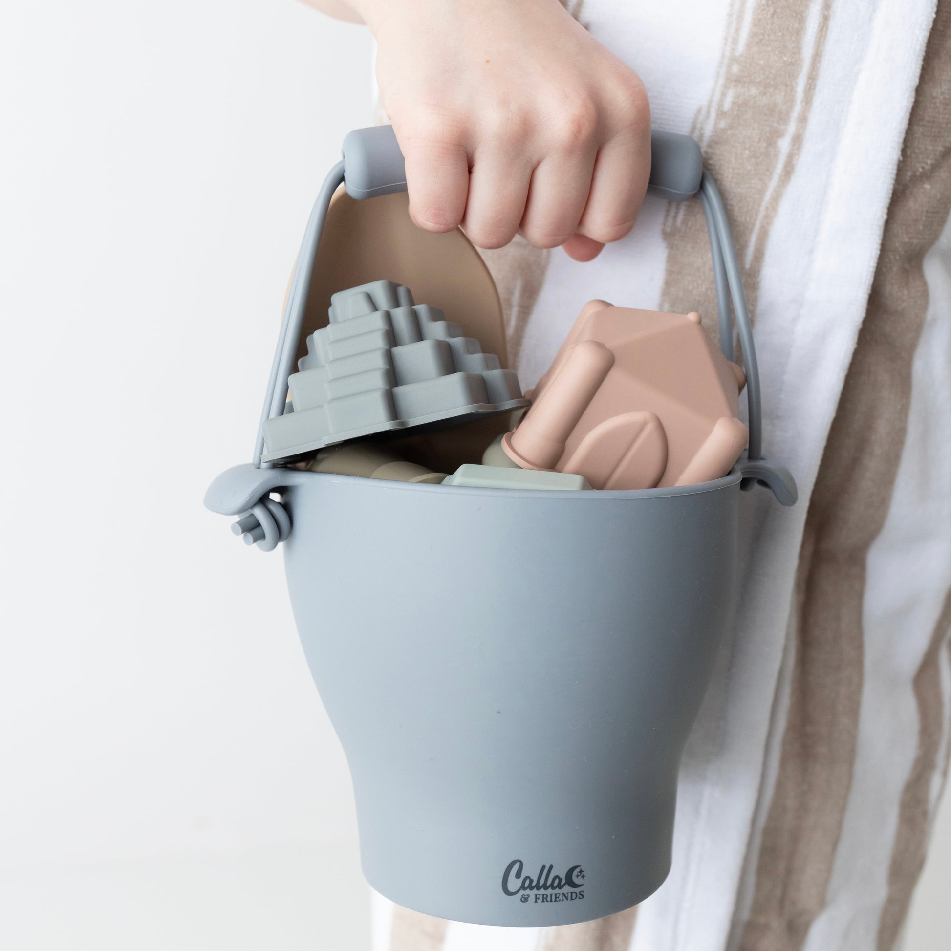 Each set includes: 1 bucket, 1 small shovel, 5 sand molds & an organic cotton storage bag