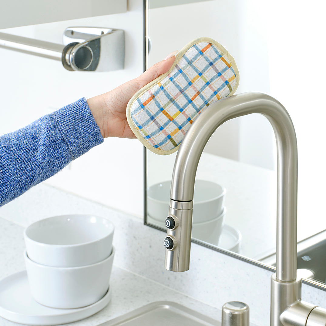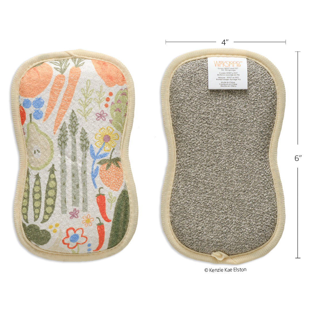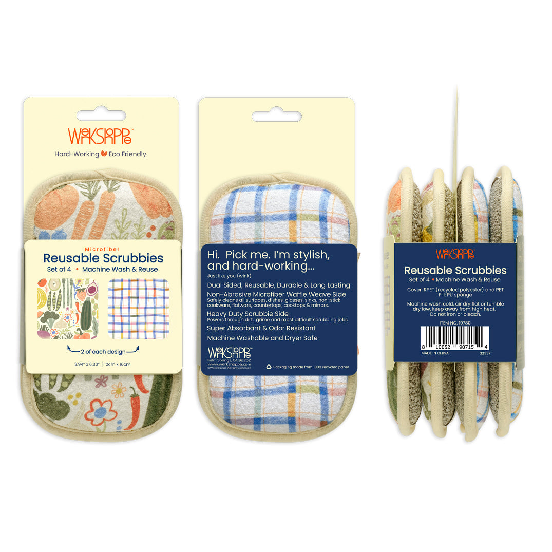 A set of 4 hard working microfiber scrubbies consists of 2 coordinating designs - a variety of tossed fruits and vegetables and a multicolor windowpane plaid. These are perfect kitchen clean up helpers.