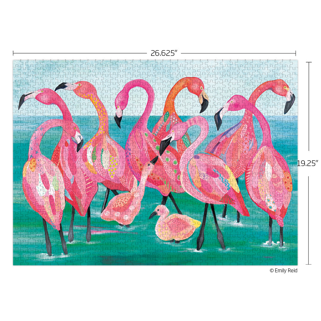 Emily's vibrant flock of flamingos, with patterned, quilt-like feathers, has us dreaming of the tropics. This 1000 piece puzzle will brighten up the dullest of days!