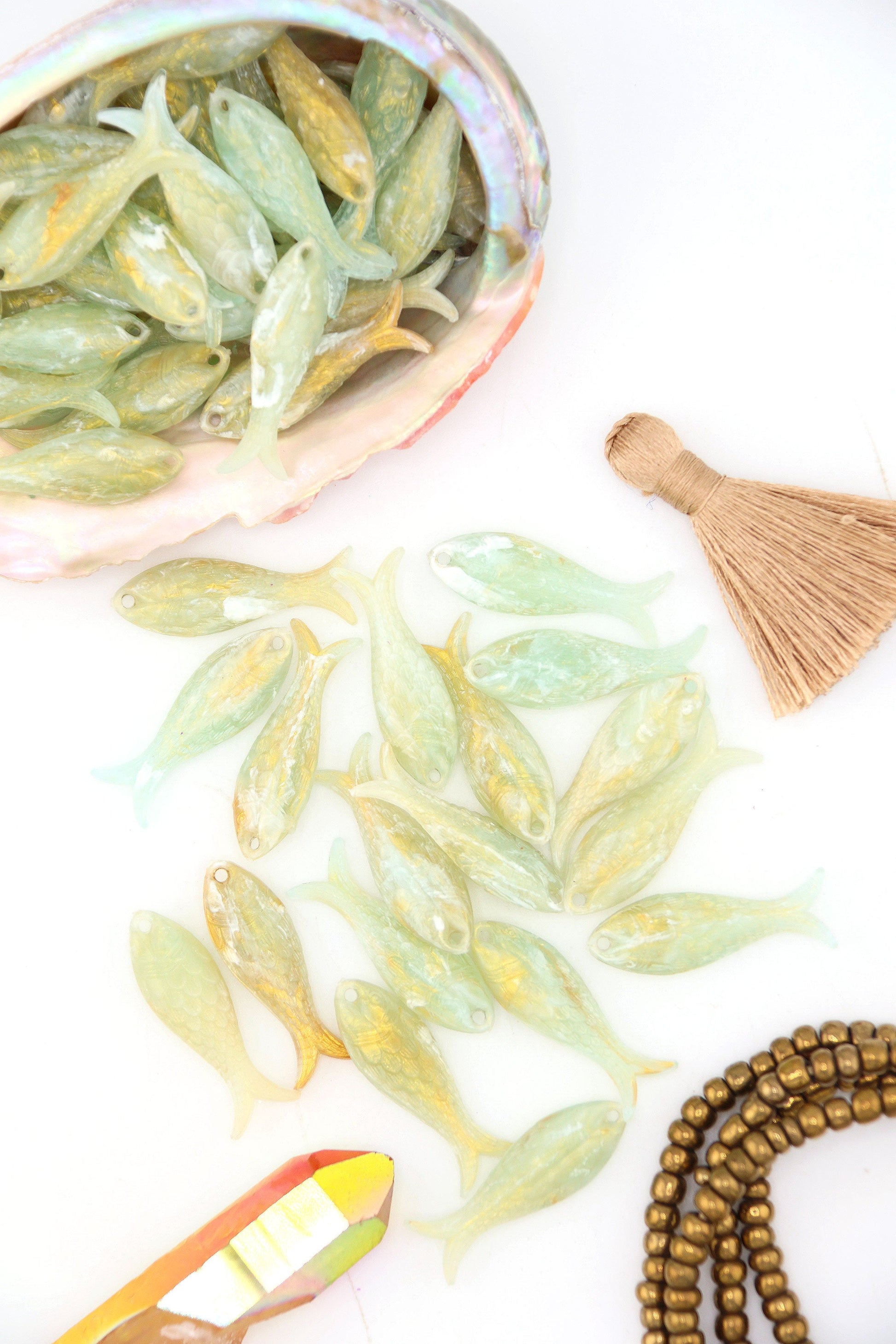 Subtle shimmer, ocean magic—these golden sage resin fish charms are a dreamy addition to your DIY stash. 🌊 Each charm is cast in translucent sage green resin with flecks of golden shimmer that catch the light like sunlight on water. Their carved scale detail gives them texture and depth, making them perfect for jewelry with a little whimsy and shine.