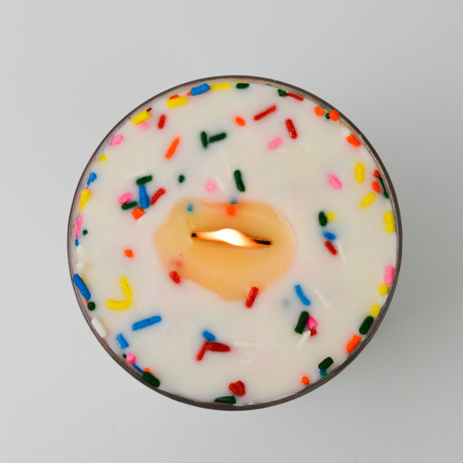 | D E T A I L S : | NOTES OF VANILLA, BIRTHDAY CAKE, HONEY, & BUTTERCREAM / SPRINKLES MOD-PODGED TO THE JAR & SPRINKLED ON TOP. SAFE TO BURN / BACK CANDLE READS CONTINUE GOOD BY GIVING A COMPLIMENT TO THE BIRTHDAY PERSON |